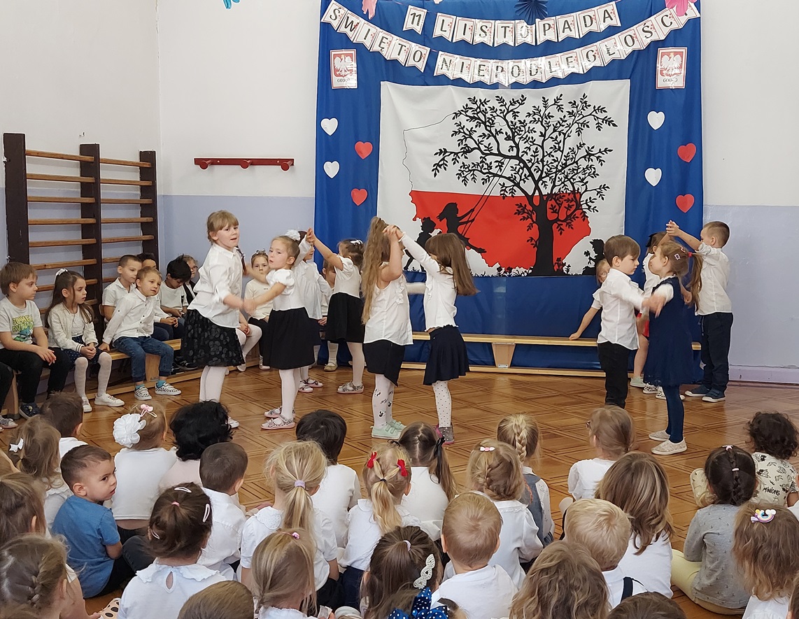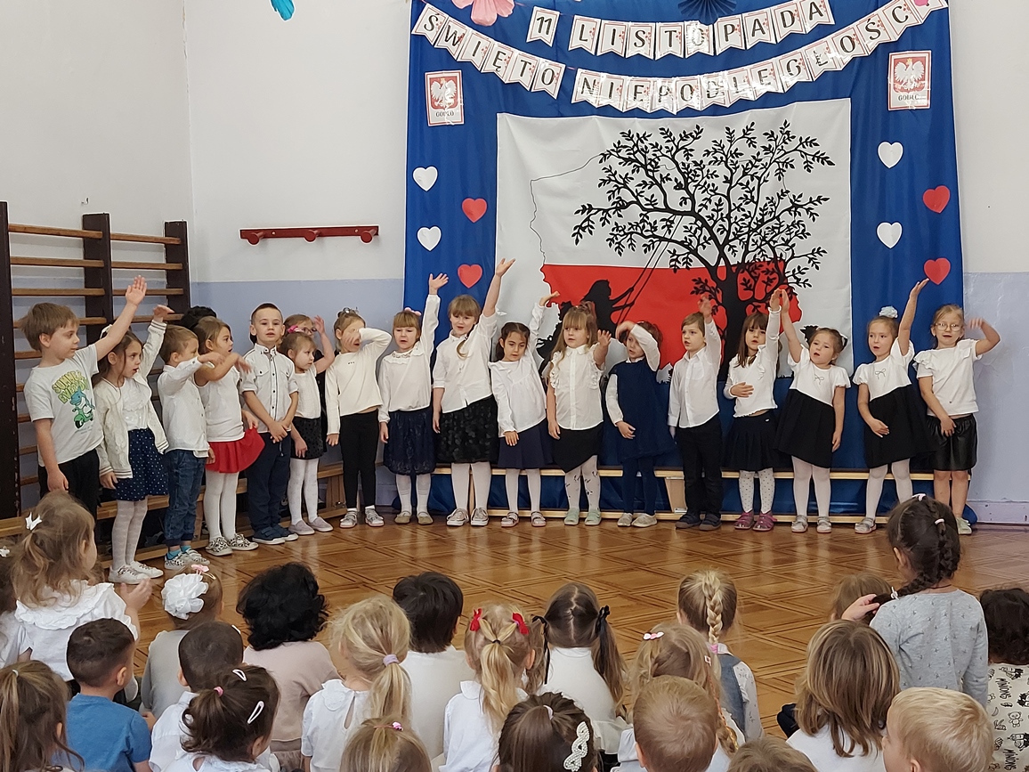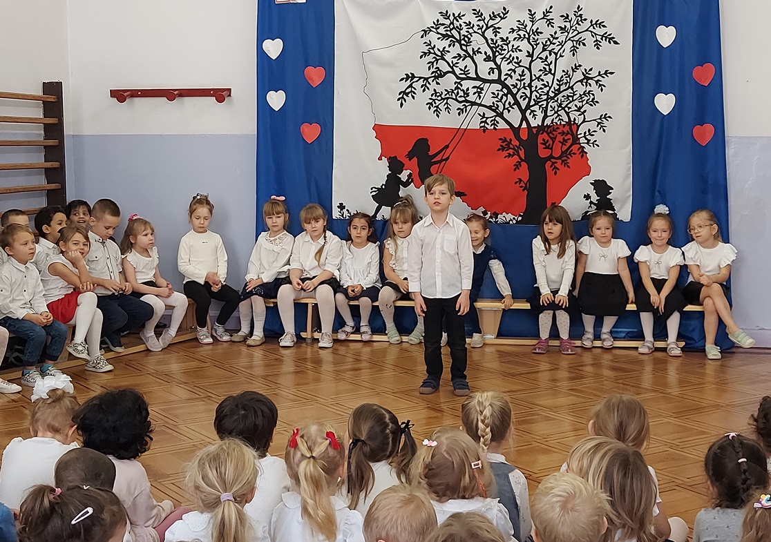 Dzieci z ogromnym zaangażowaniem wcieliły się w role małych patriotów. Zaprezentowały piękne wiersze i pieśni, przypominając wszystkim, jak ważne są takie wartości jak wolność, jedność i miłość do Ojczyzny. Podczas występu nie zabrakło również narodowych symboli - biało-czerwonych flag i dekoracji, które wprowadziły wszystkich w podniosły, ale zarazem bardzo ciepły nastrój oraz hymnu, który zaśpiewały wszystkie zgromadzone na uroczystości przedszkolaki.