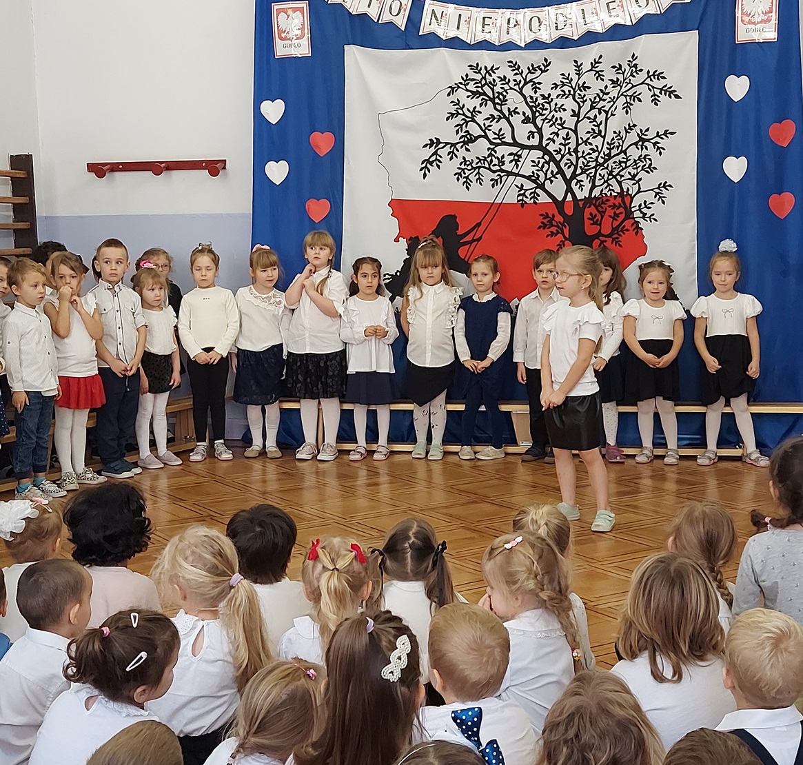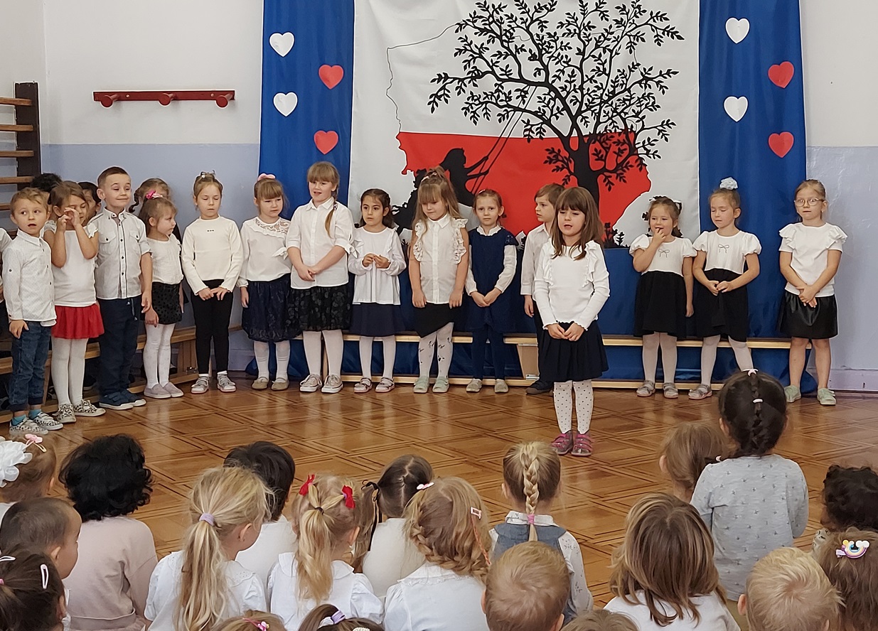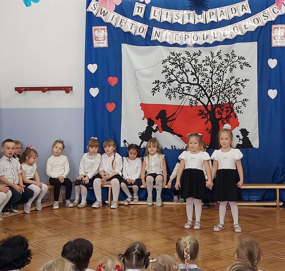 Dzieci z ogromnym zaangażowaniem wcieliły się w role małych patriotów. Zaprezentowały piękne wiersze i pieśni, przypominając wszystkim, jak ważne są takie wartości jak wolność, jedność i miłość do Ojczyzny. Podczas występu nie zabrakło również narodowych symboli - biało-czerwonych flag i dekoracji, które wprowadziły wszystkich w podniosły, ale zarazem bardzo ciepły nastrój oraz hymnu, który zaśpiewały wszystkie zgromadzone na uroczystości przedszkolaki.