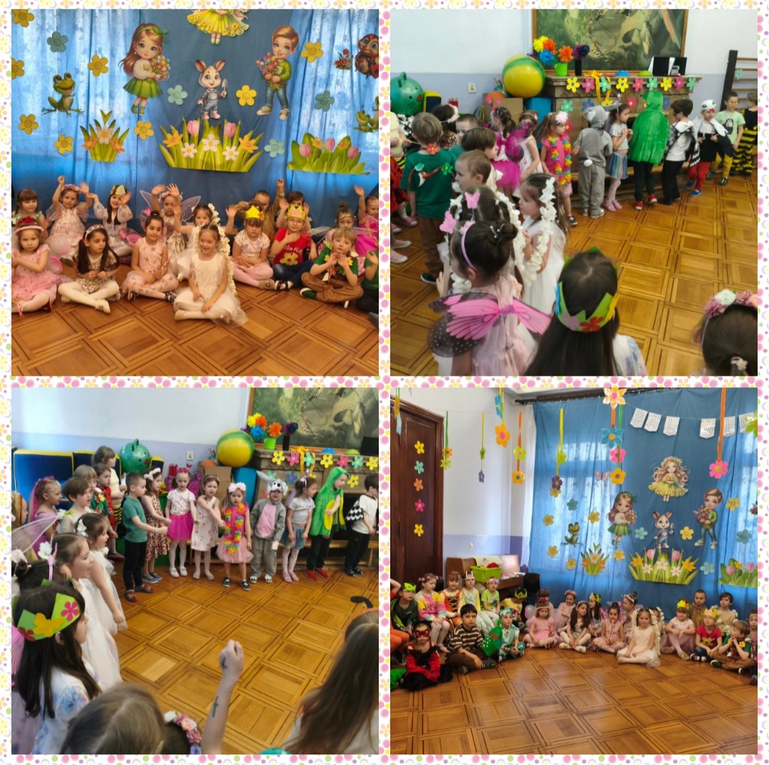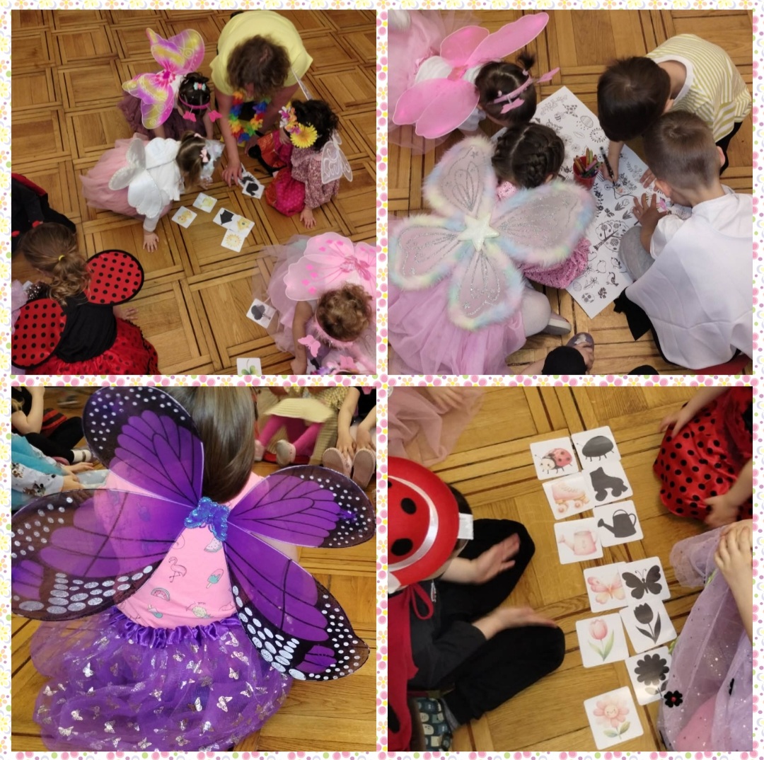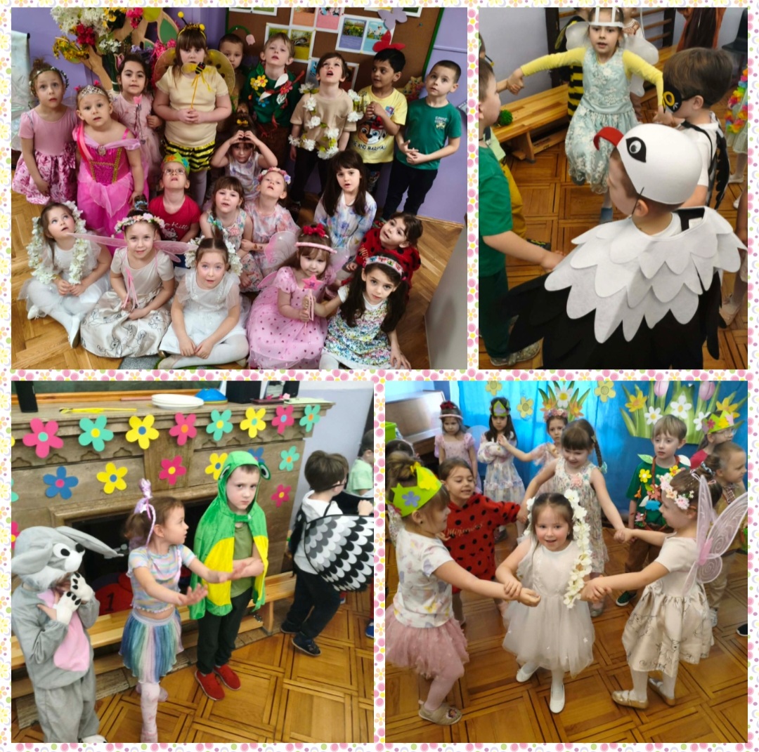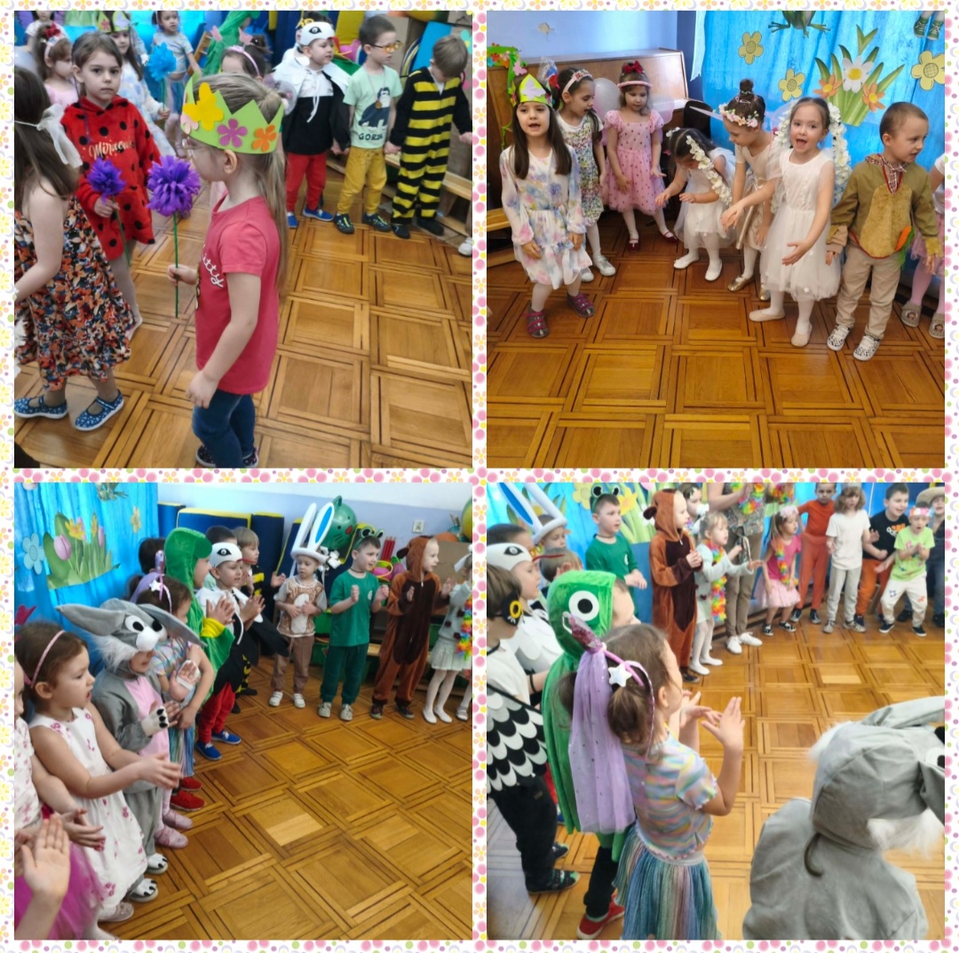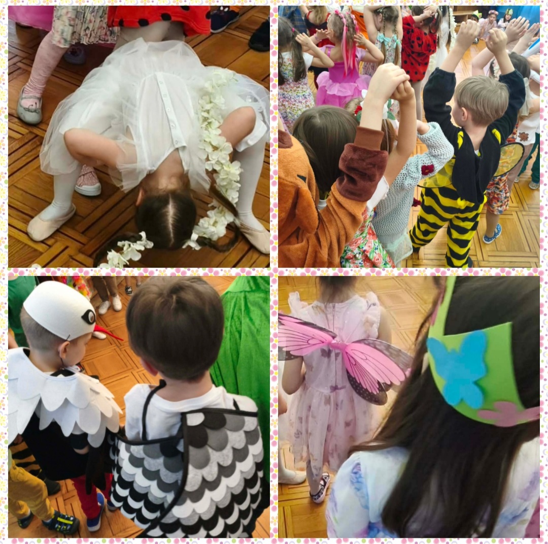 Od samego rana dzieci z niecierpliwością czekały na rozpoczęcie zabawy. Gdy tylko pojawiły się w sali, zrobiło się niezwykle kolorowo – mogliśmy podziwiać przepiękne stroje inspirowane wiosną. Były kwiaty, motylki, pszczółki, biedronki, króliczki, bociany, Panie Wiosny, a nawet promyki słońca i małe chmurki! Każde dziecko wyglądało wyjątkowo i z dumą prezentowało swój strój.