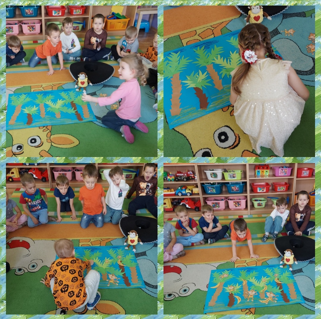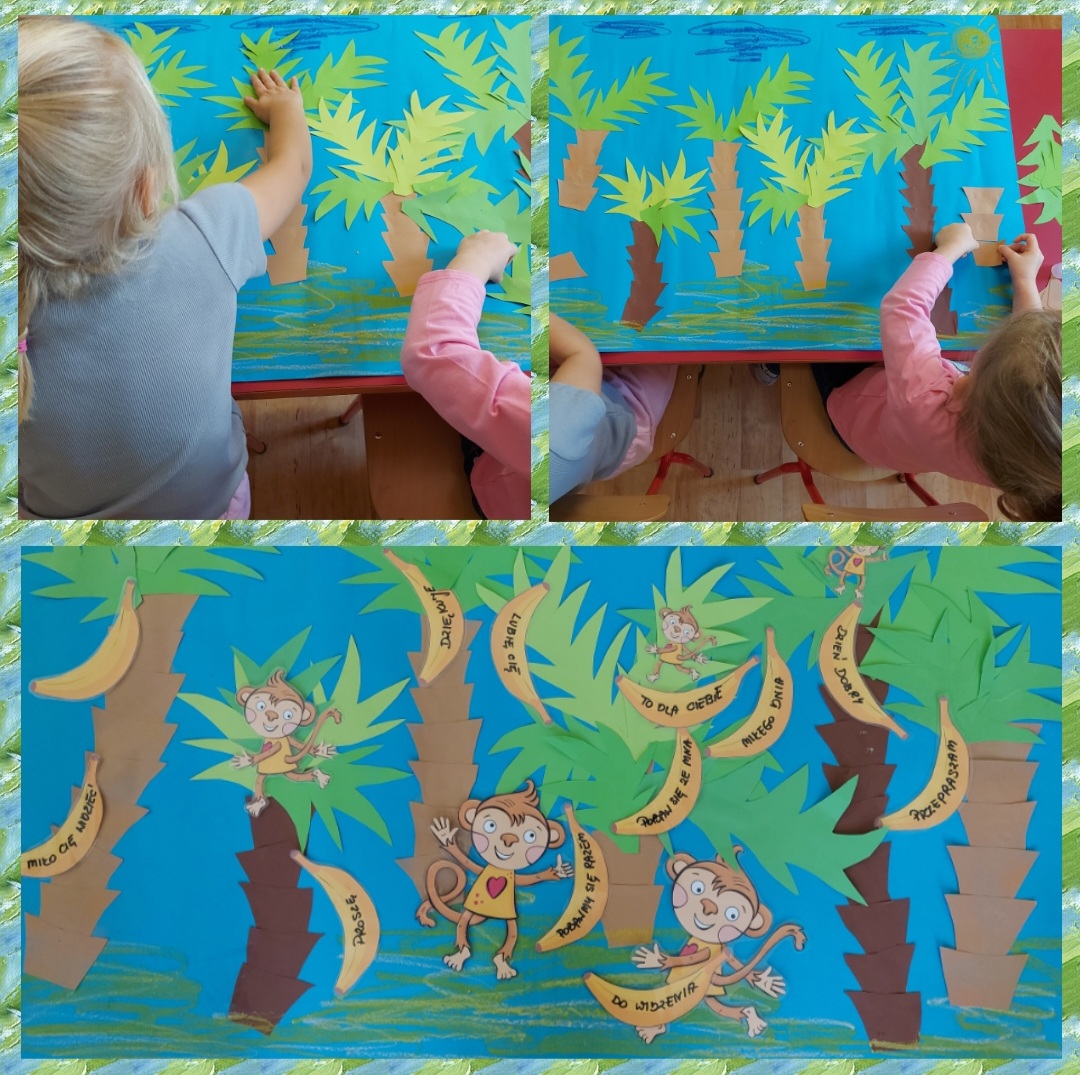 Dzieci wspólnie zaprojektowały i przygotowały "Gaj Życzliwości", wspólnie poszukiwały magicznych słów i zwrotów, które ułatwiają bycie miłym dla kolegów i koleżanek oraz dają dobre samopoczucie wszystkim w naszym otoczeniu. Wybrane "miłe słowa" zapisane na bananach zostały umieszczone w Gaju. Na zakończenie dzieci próbowały odegrać role/scenki - powitania i pożegnania z różnymi osobami z użyciem miłych słów i zwrotów grzecznościowych.