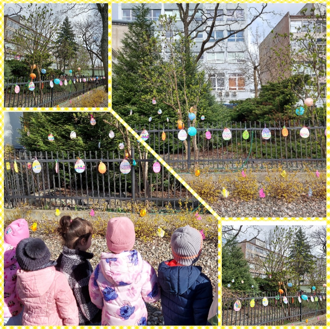Wielkanoc - czas radości i oczekiwania.Oczekiwanie na święta upłynęło w naszym przedszkolu na tworzeniu dekoracji, które zamieniły nasz ogród przedszkolny w wielkanocną krainę. Dzieci ze wszystkich grup złapały za kredki, mazaki, pędzle, naklejki ... i zabrały się do tworzenia: kolorowych pisanek, żółtych kurczaczków, słodkich króliczków i puchatych baranków. Te dzieła sztuki ozdobiły nasz ogród przedszkolny, wprowadzając dzieci, pracowników i rodziców w świąteczny nastrój.