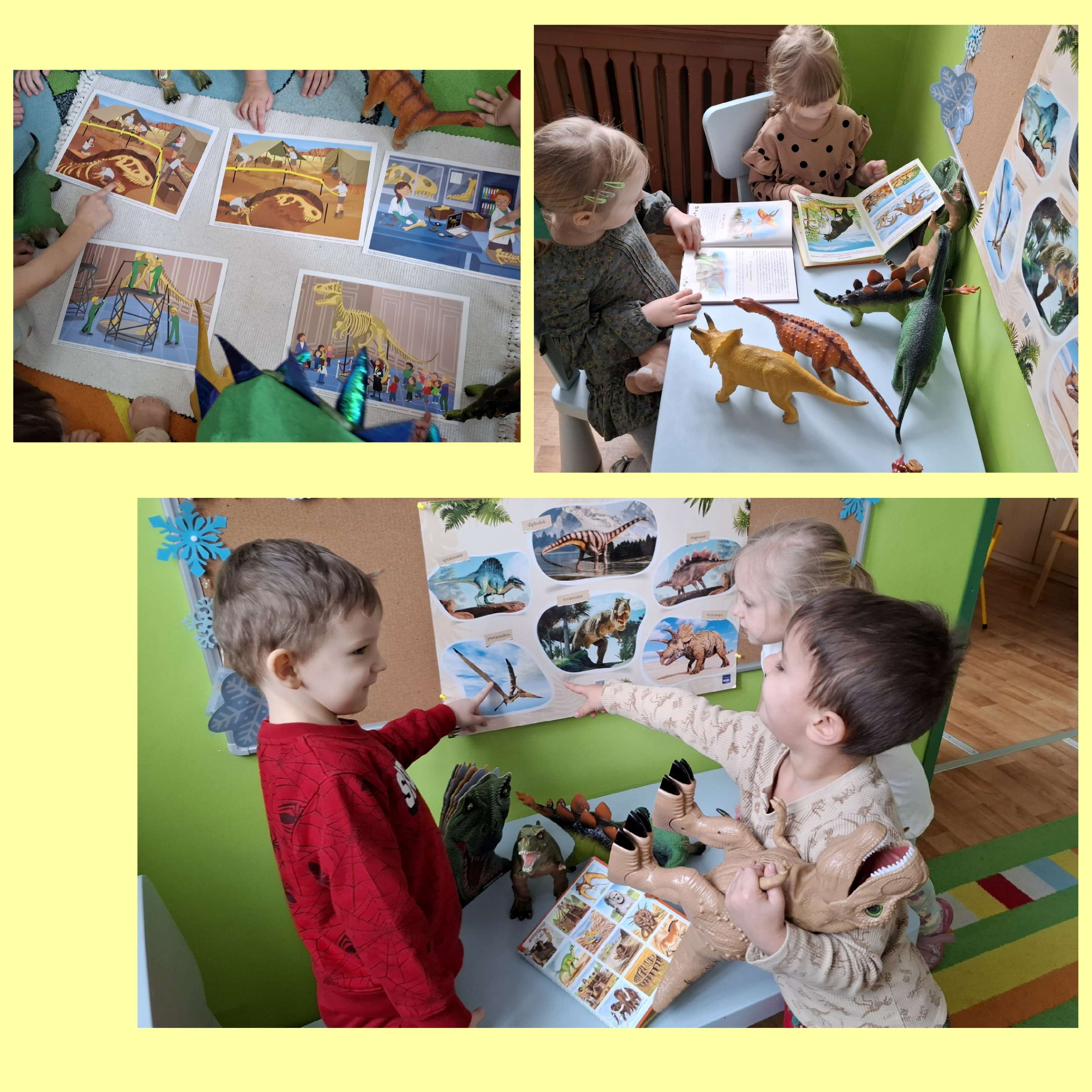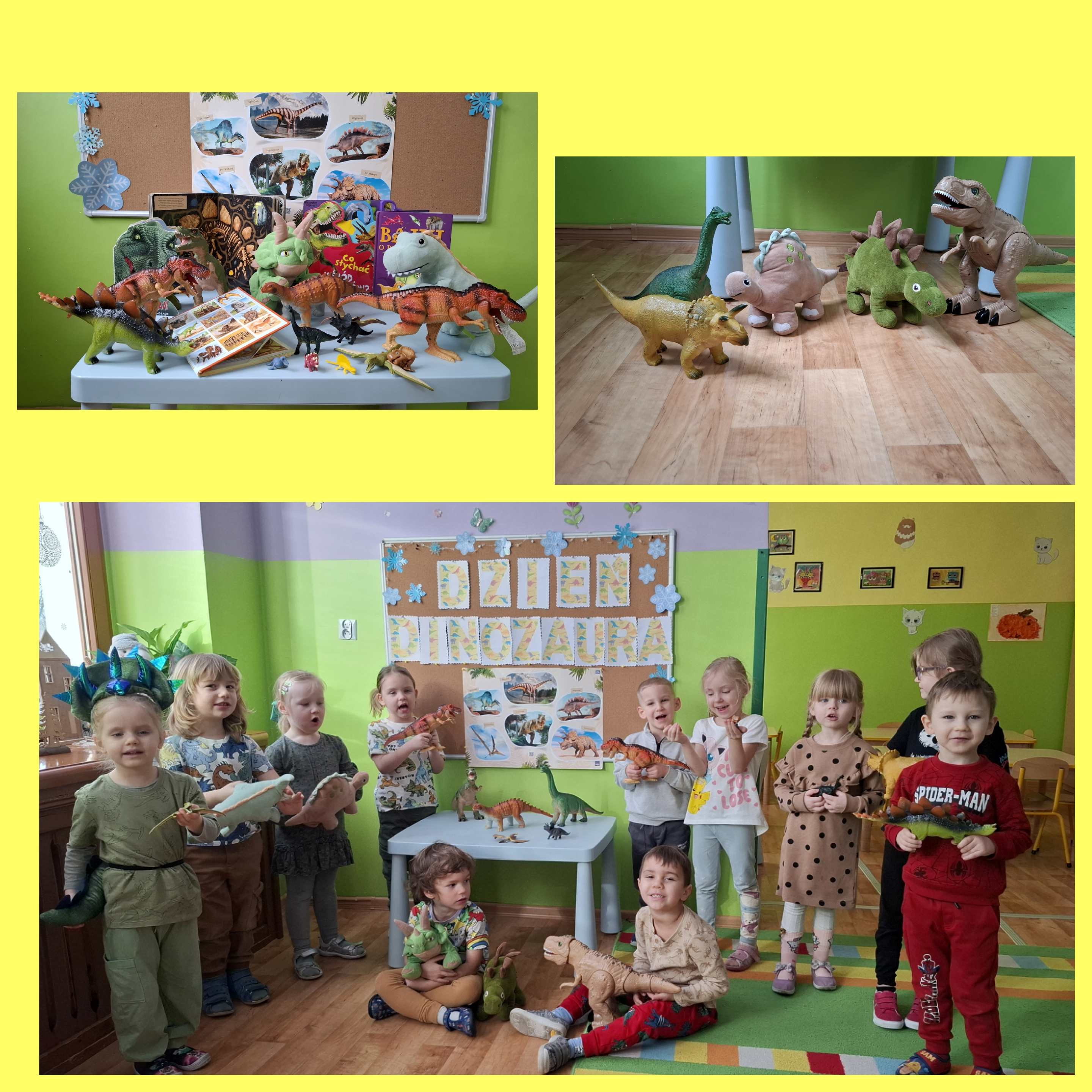 W ostatnim tygodniu lutego gościliśmy w naszej grupie dinozaury. Te olbrzymie zwierzęta zmieściły się w naszej sali i w przedszkolu, ponieważ przedszkolaki przyniosły z okazji „Dnia dinozaura” swoje ulubione zabawki przedstawiające sylwety dinozaurów, książki i albumy dotyczące świata zwierząt żyjących przed milionami lat. Mieliśmy ciekawe rozmowy o dinozaurach, których przysmakiem były rośliny lub mięso. Przedszkolaki dowiedziały się także o zawodzie paleontologa, którego praca polega na badaniach nad dinozaurami np. na podstawie skamieniałości i kości zwierząt zachowanych we wnętrzu skał. Ciekawostek o świecie tych zwierząt jest bardzo dużo. Dzieci słuchały czytane przez nauczycielkę zagadki i oglądały ilustracje przedstawiające np. diplodoka, brachiozaura, tyranozaura. Ten dzień upłynął nam na wielu wesołych zabawach: muzyczno-ruchowych, plastycznych i konstrukcyjnych.