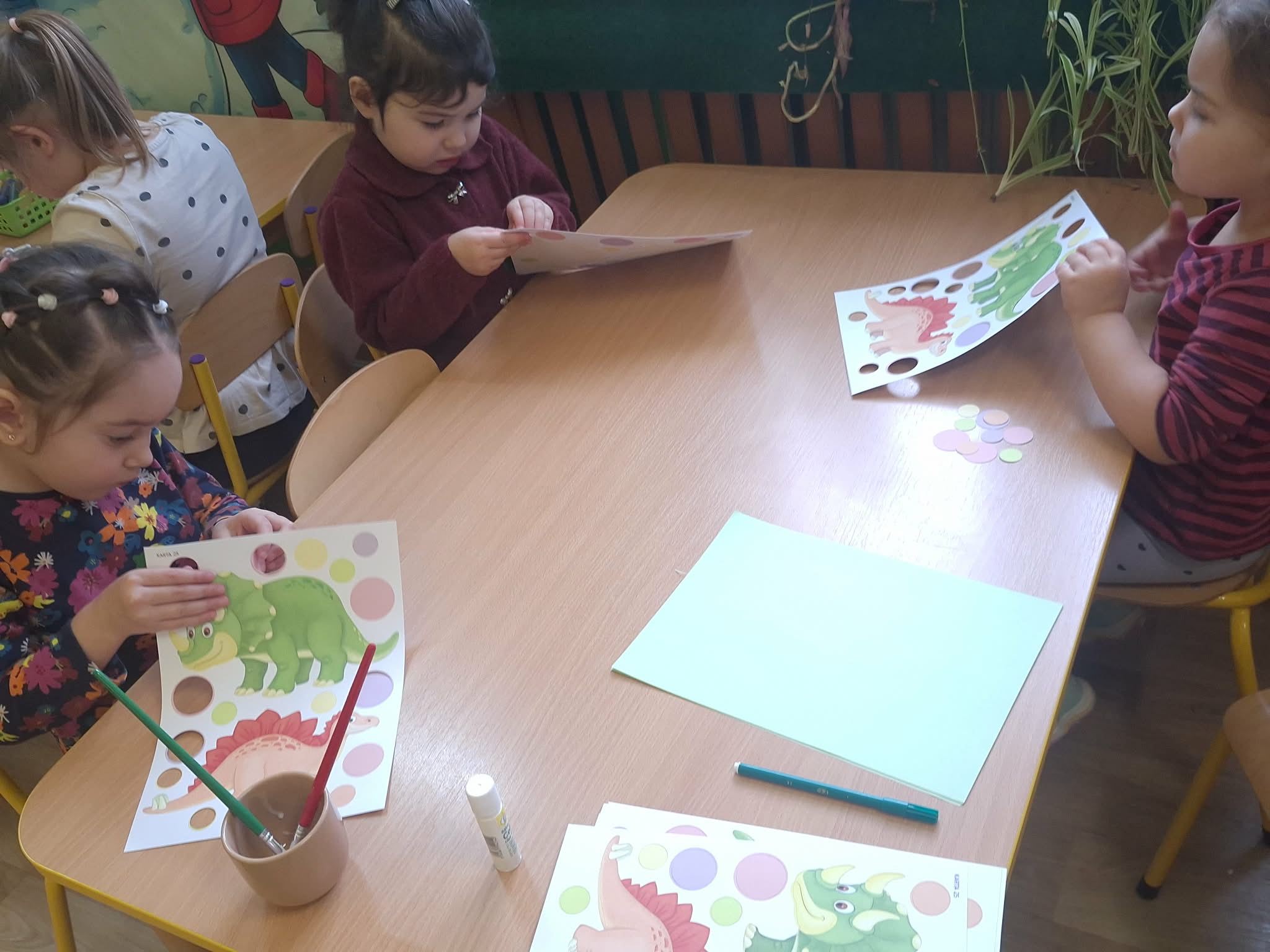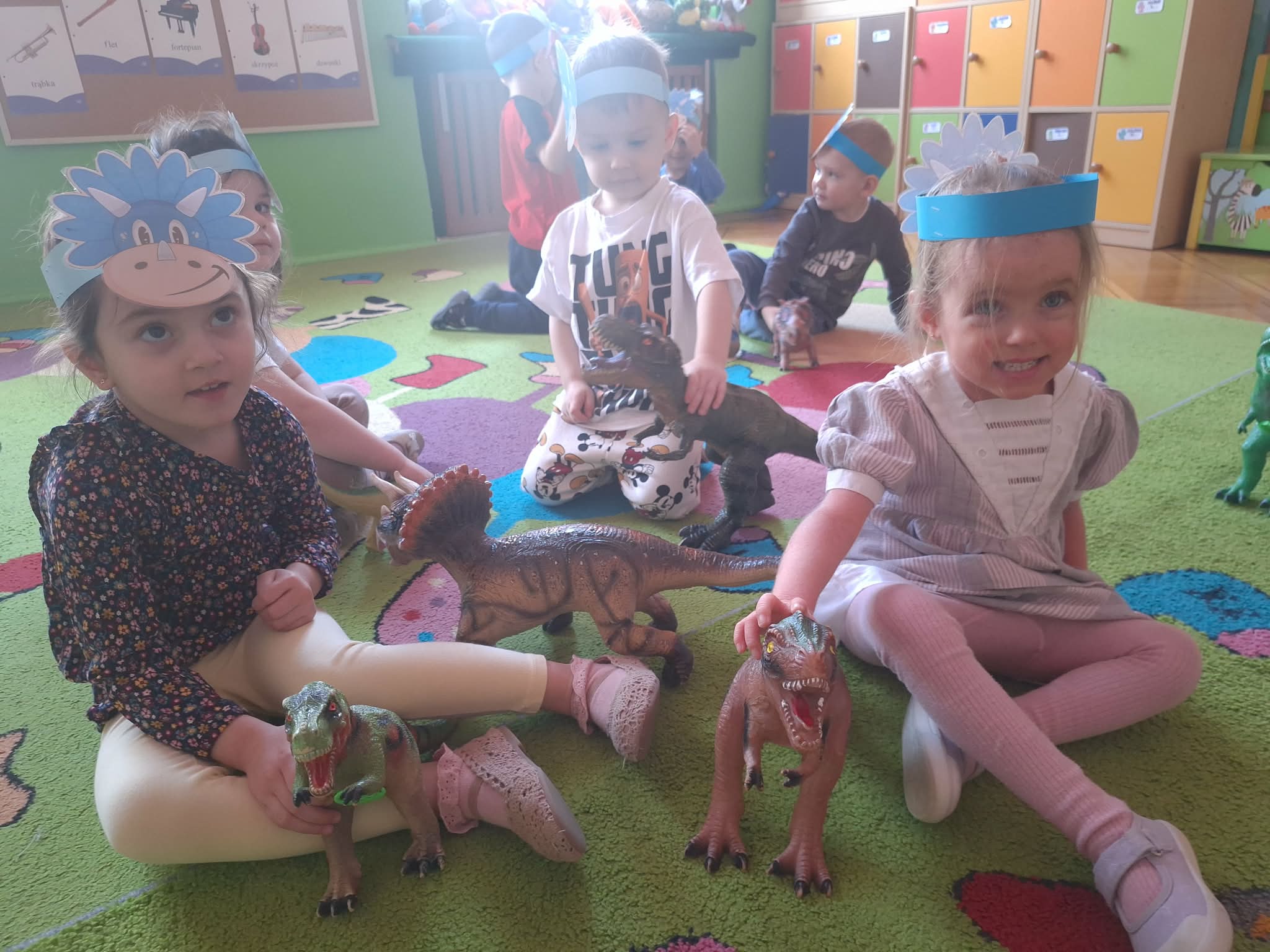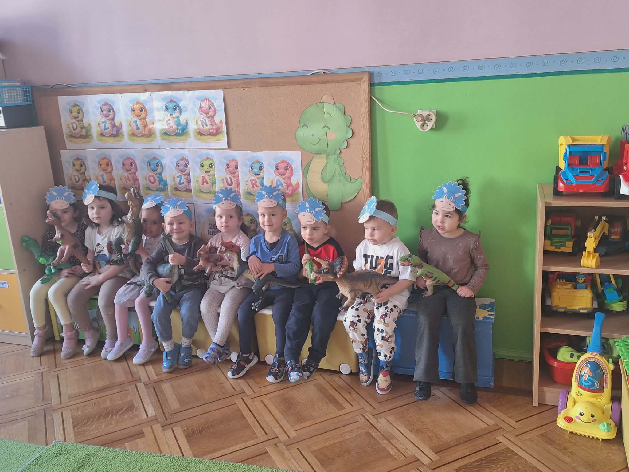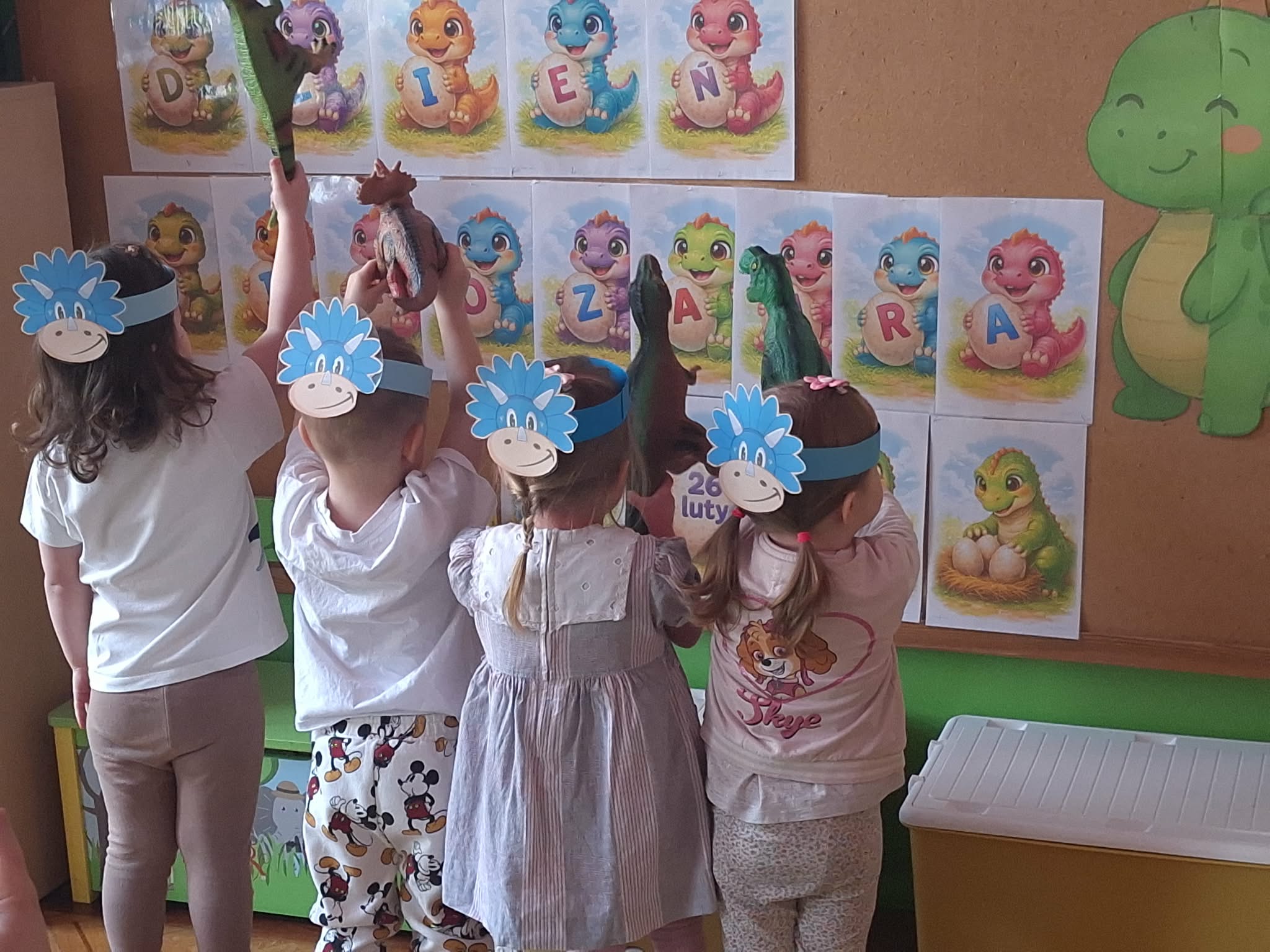 26 lutego w naszej grupie odbyły się zabawy z okazji "Dnia Dinozaura". Dzieci założyły opaski dinozaurów, zatańczyły taniec „Dino, Dinozaury”. Ułożyły również puzzle - dopasowując ze sobą odpowiadające elementy układanki. Bawiły się figurkami dinozaurów. Wykonały pracę plastyczną o dinozaurach. Poszukały ukrytego dinozaura w sali w zabawie "ciepło -zimno". To był udany dzień.