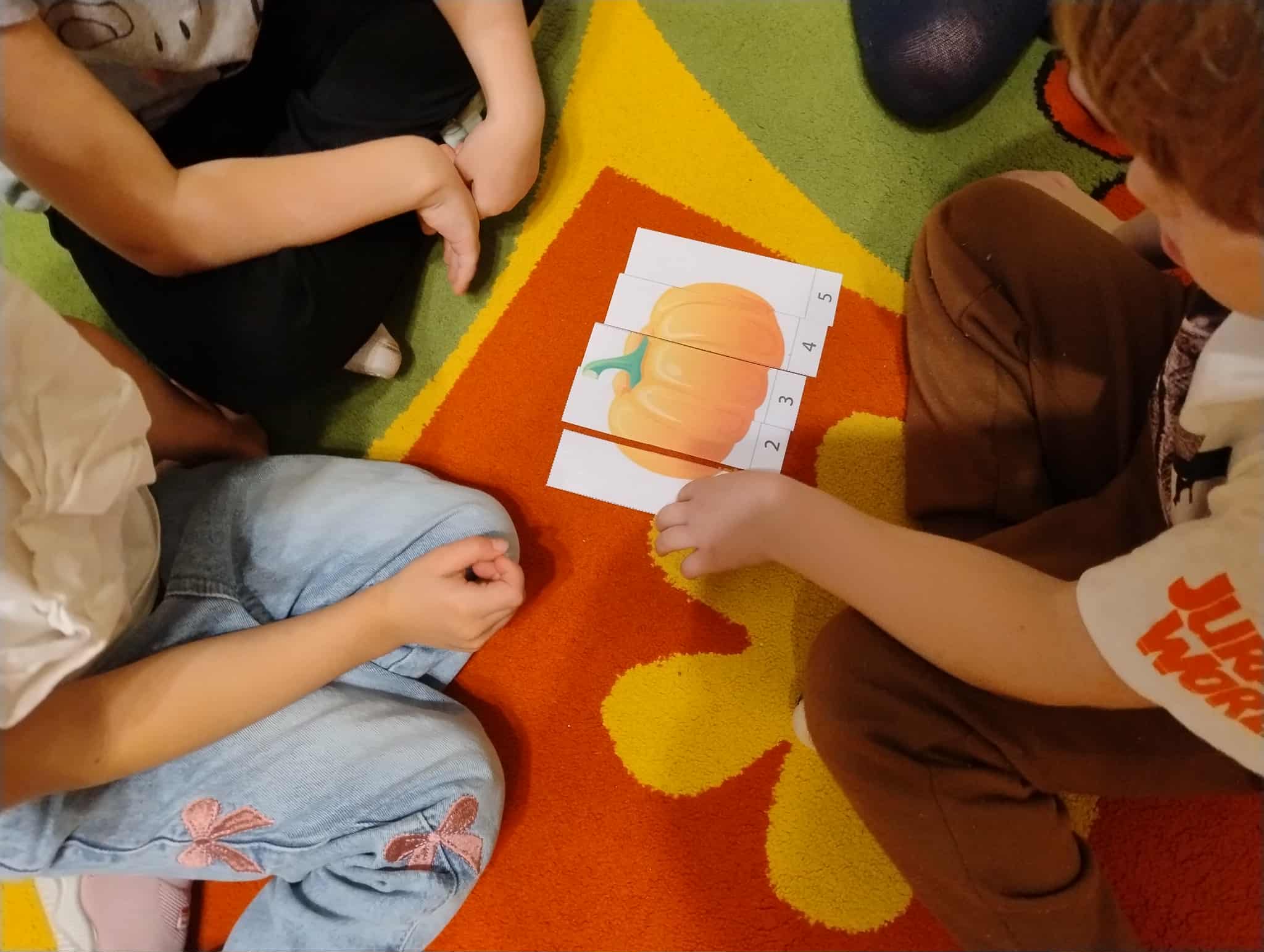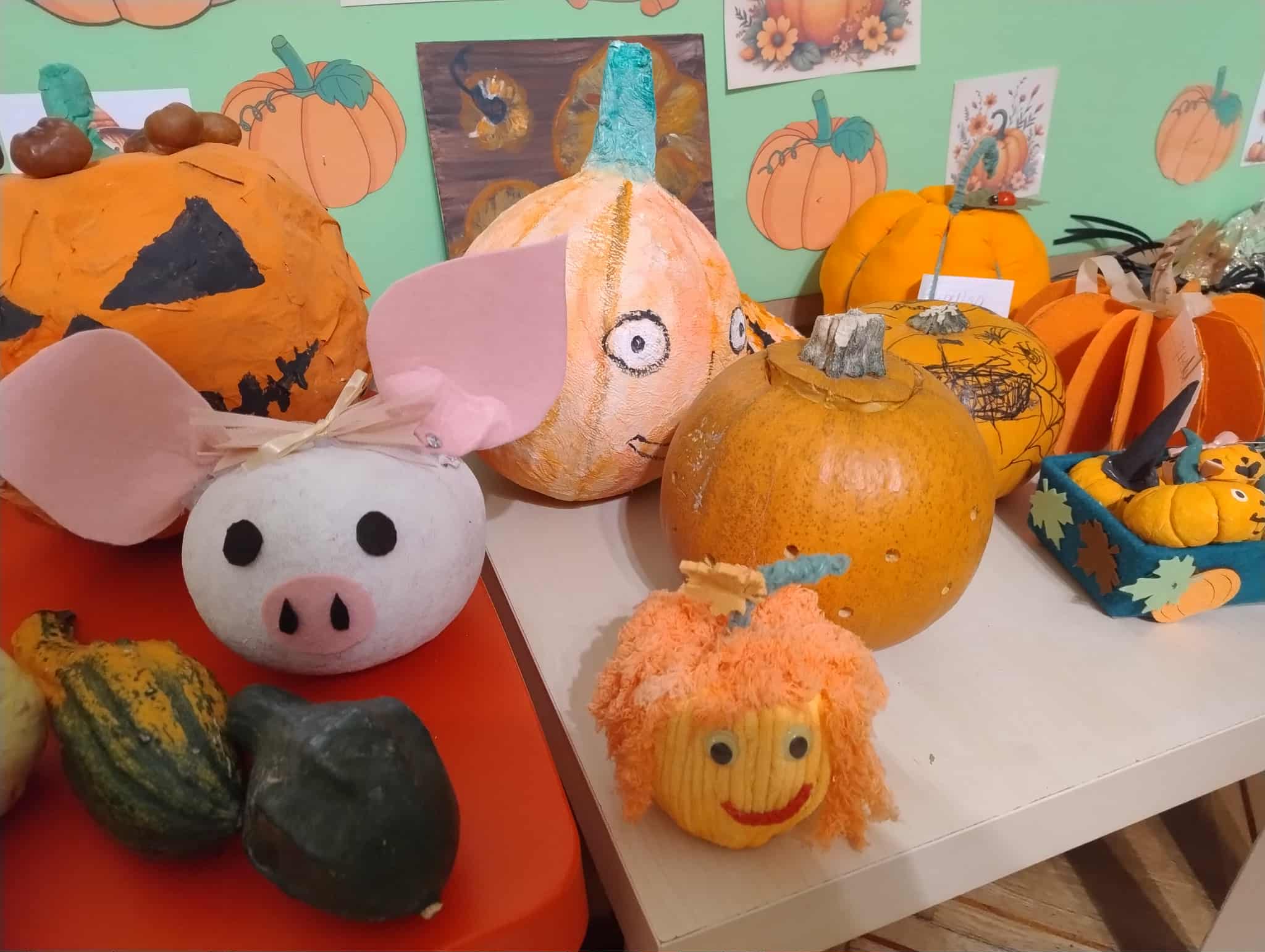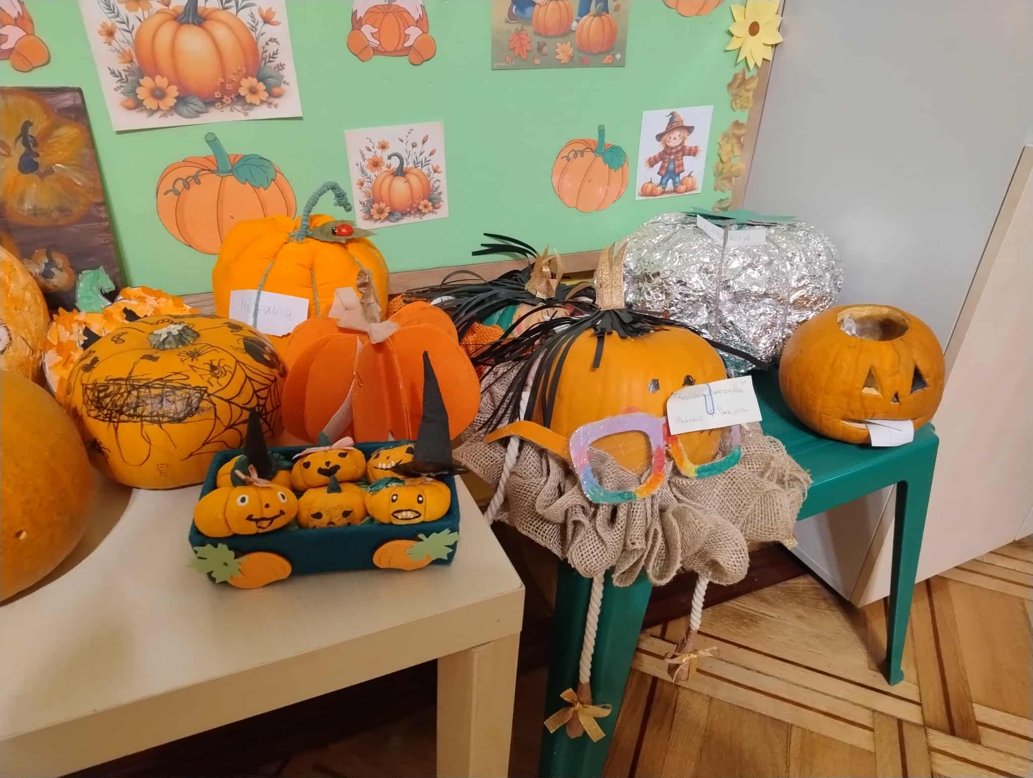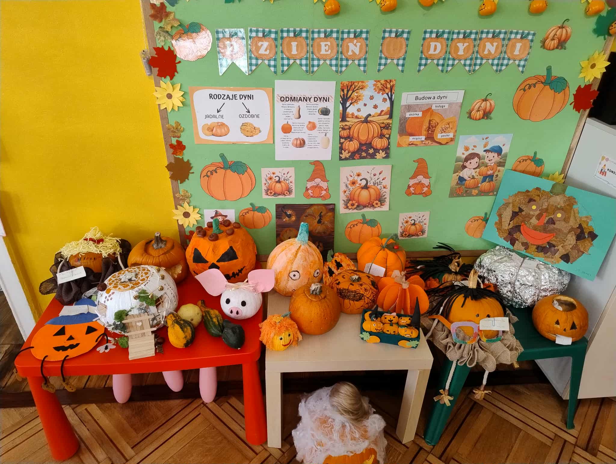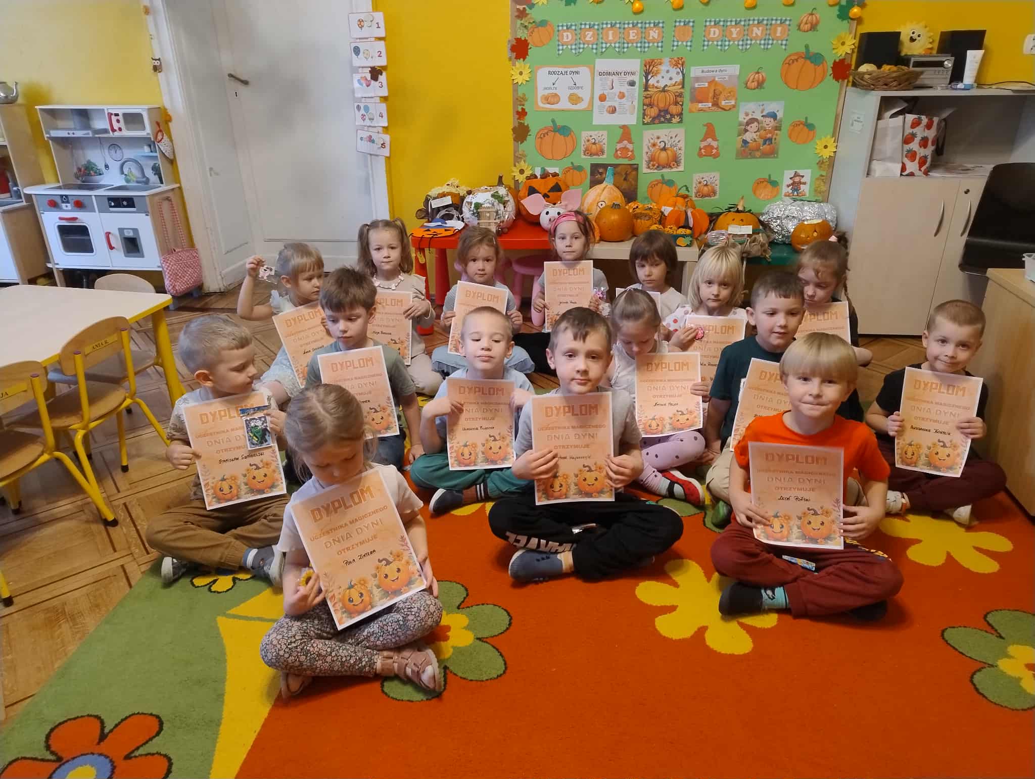 Nasza grupa obchodziła "Dzień dyni", podczas którego poznaliśmy różne gatunki dyń - jadalne i ozdobne. Braliśmy udział w zabawach matematycznych, gdzie w małych zespołach wykonywaliśmy różne zadania, wspólnie je rozwiązując. Na święto dyni dzieci przyniosły wykonane wspólnie z rodzicami prace plastyczne, na które składały się eksponaty z prawdziwych dyń oraz prace plastyczne. Dzieci otrzymały dyplomy i drobne upominki za udział w konkursie.