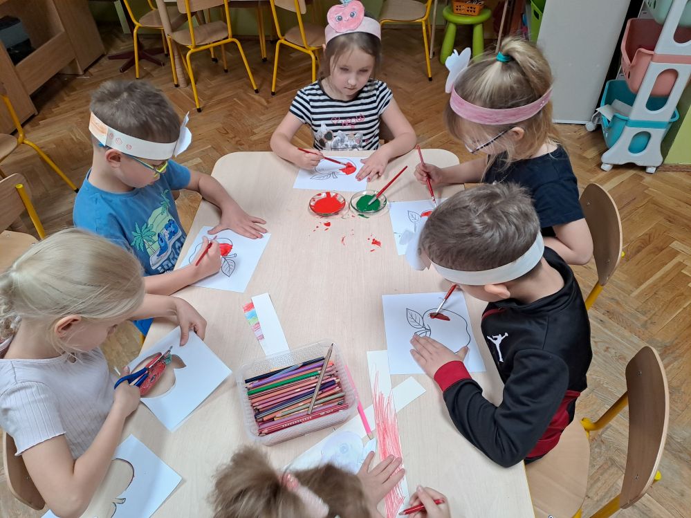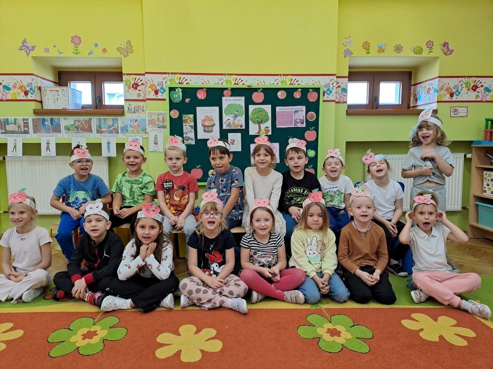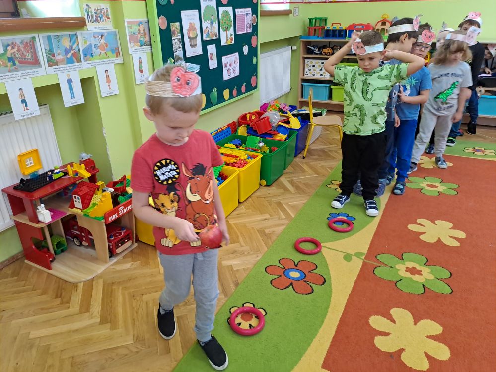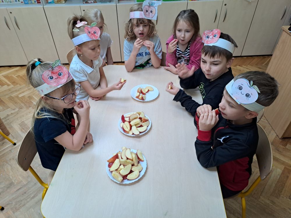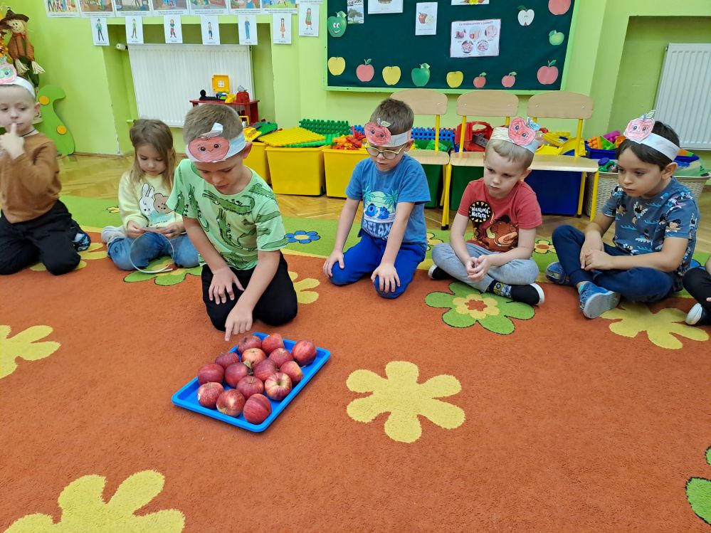 We wrześniu w naszej grupie świętowaliśmy „Dzień jabłka”. Głównym celem było promowanie zdrowego odżywiania oraz zachęcanie dzieci do spożywania jabłek. Rozmawialiśmy na temat skąd biorą się jabłka, wartości odżywczych oraz co można z nich zrobić. Wykorzystaliśmy owoce do zabaw matematycznych, ruchowych np. nosząc je na talerzykach lub łyżce. Dzieci zrobiły wspólną jabłoń malując jabłka. Każdy wykonał własną opaskę, która zabrał do domu. Była również degustacja jabłek.