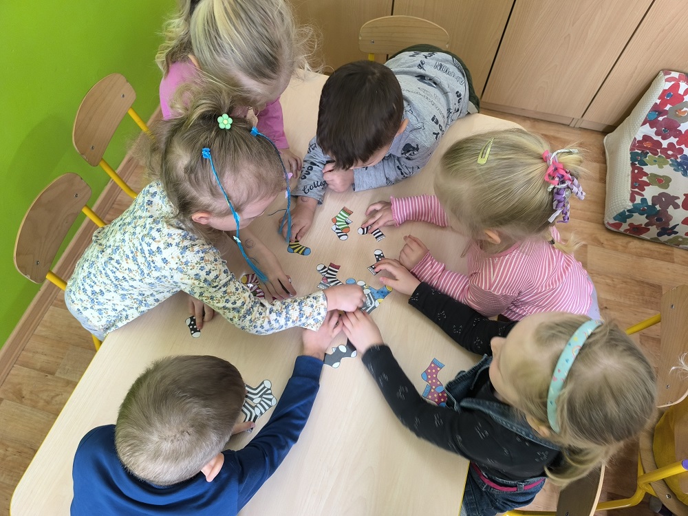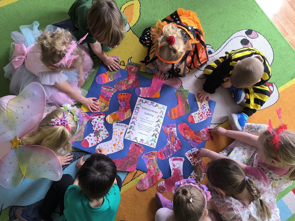 19 marca odbył się w naszym przedszkolu "Dzień Kolorowej Skarpetki". Wszyscy tego dnia założyli kolorowe, nie do pary skarpetki na znak solidarności z osobami z Zespołem Downa. Zakładając kolorowe, niepasujące skarpetki zwracamy na siebie uwagę, a tym samym zwracamy uwagę na problemy ludzi z Zespołem Downa. Pokazujemy, że różni nas od nich tak niewiele. Tego dnia ”Kotki” oglądały i opowiadały o swoich kolorowych skarpetkach, uważnie wysłuchały co to jest za dzień i dlaczego jest obchodzony. W trakcie zajęć rozmawialiśmy o tym, czym jest inność i dlaczego każdy z nas jest wyjątkowy. Dzieci uczestniczyły w zabawach integracyjnych, oglądały krótkie materiały edukacyjne oraz brały udział w pracach plastycznych – powstały piękne, kolorowe skarpetki, które ozdobiły naszą tablice. Dzieci segregowały skarpetki i dobierały je w pary. To doskonała okazja do budowania postawy szacunku i zrozumienia już od najmłodszych lat. Dzięki takim inicjatywom dzieci uczą się, że każdy człowiek zasługuje na akceptację i życzliwość.