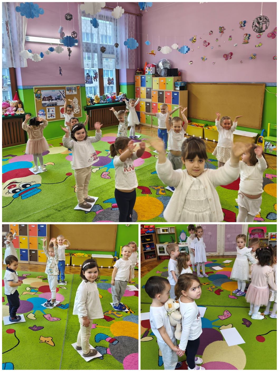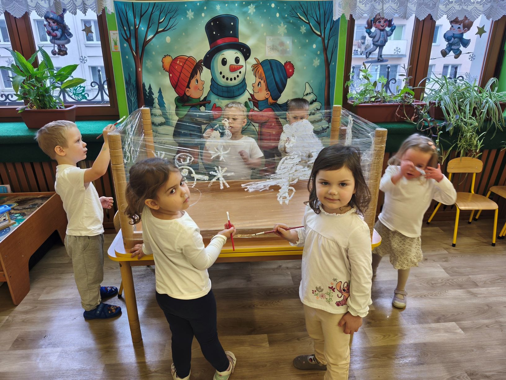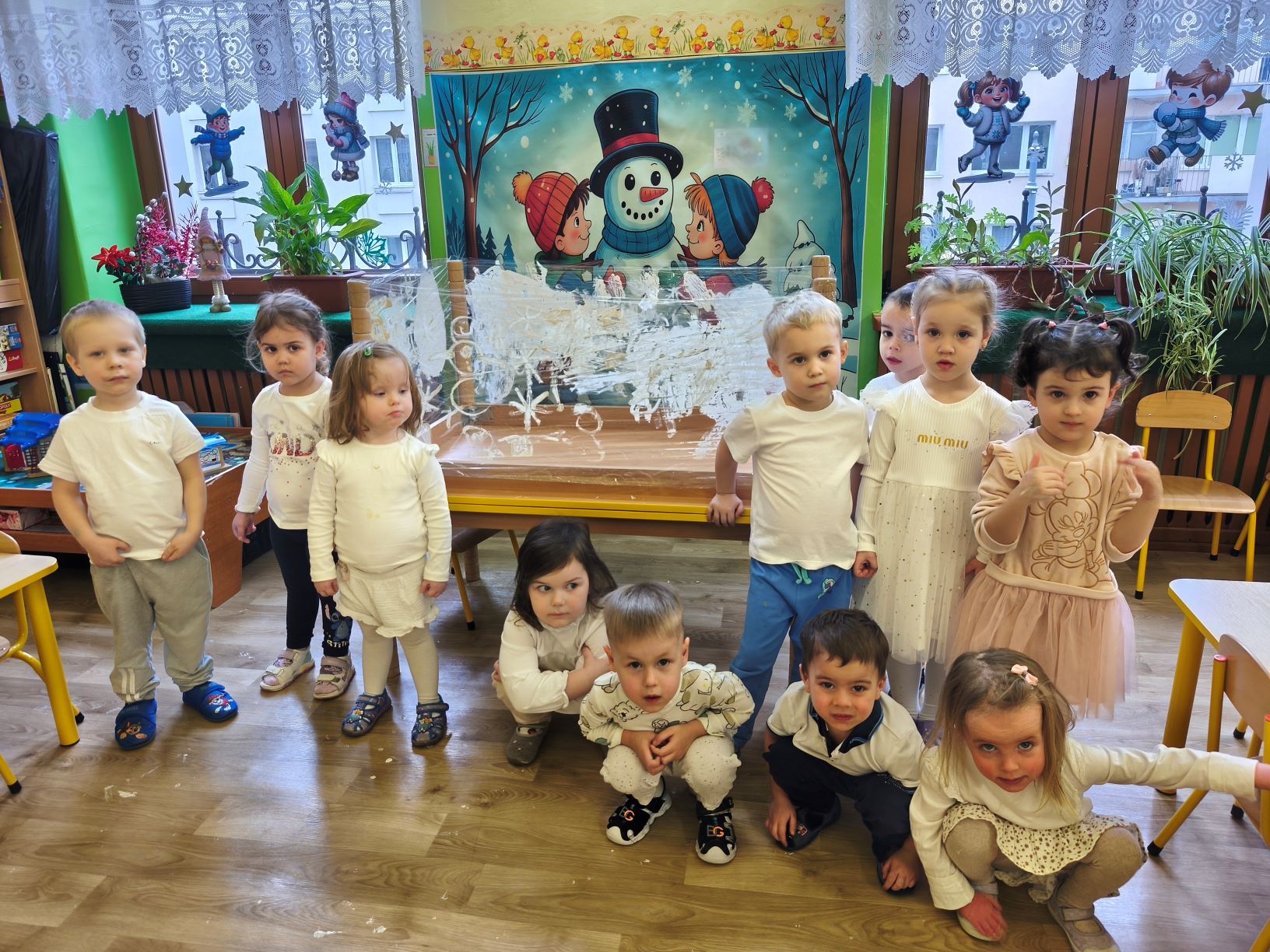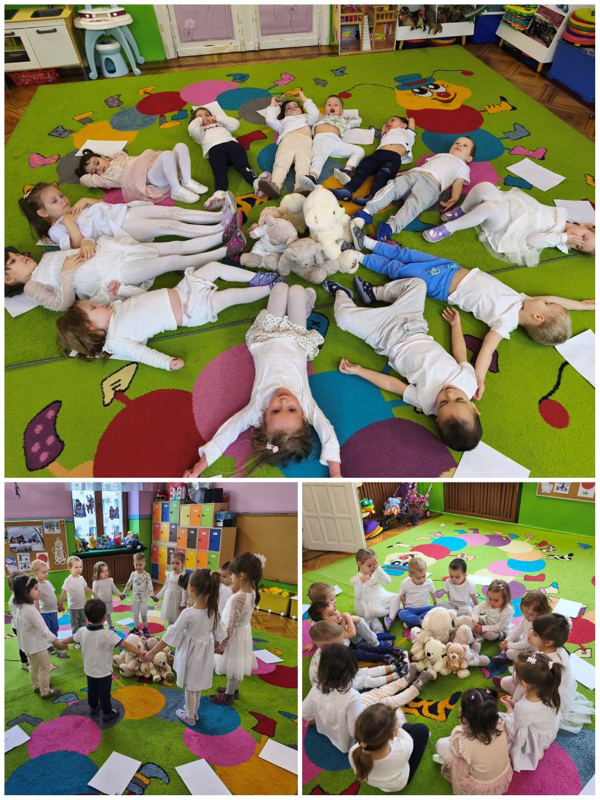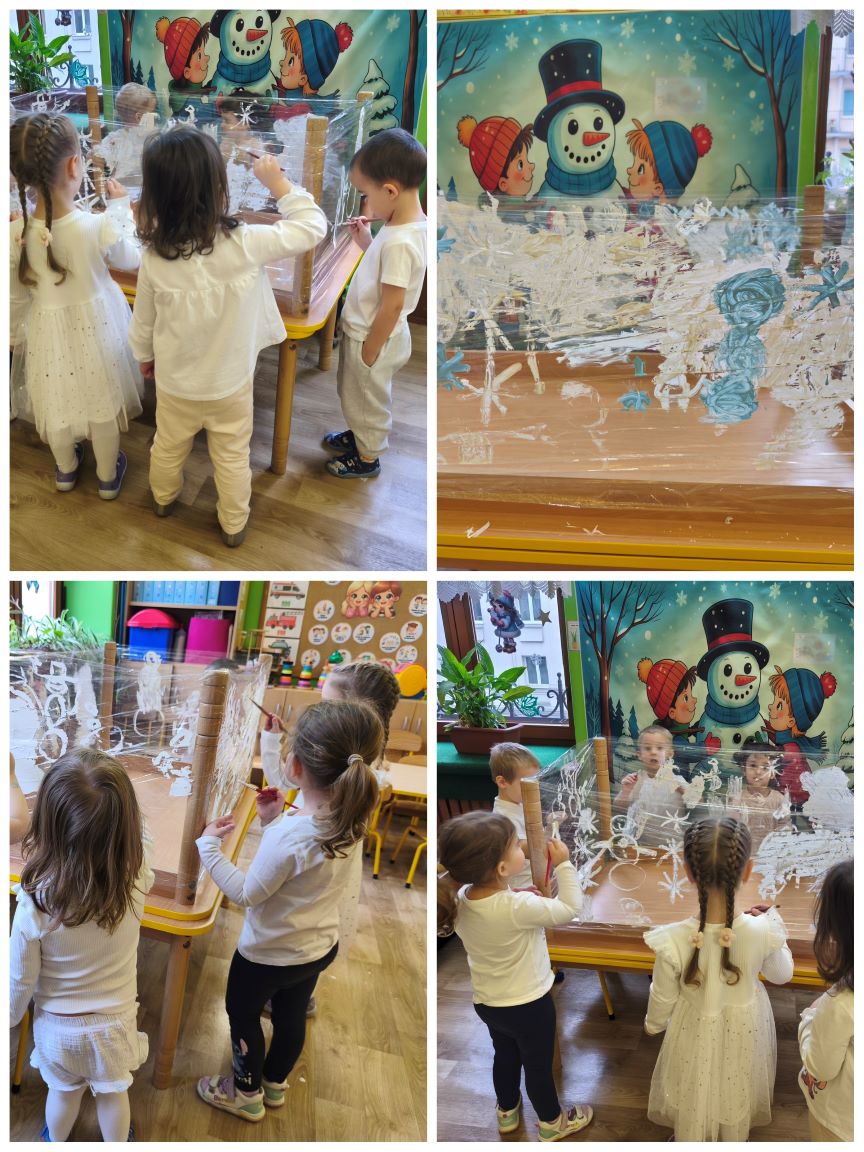 W styczniu ... jak każdego miesiąca obchodziliśmy kolorowa środę. W tym miesiącu środa była dniem koloru białego. W całym przedszkolu zrobiło się biało jak zimą. Kolor biały obecny był w naszych strojach, działaniach edukacyjnych i odnalezionych zabawkach. Tego dnia dzieci uczestniczyły w zabawach ruchowych przy zimowych piosenkach. Do zabaw wykorzystaliśmy białe kartki papieru. Dzieci doskonaliły umiejętność orientacji w przestrzeni i szybkiej reakcji na ustalony sygnał. Wykonaliśmy również przestrzenną pracę plastyczną o tematyce zimowej. Dzieci malowały zimowy krajobraz białą farbą na folii.