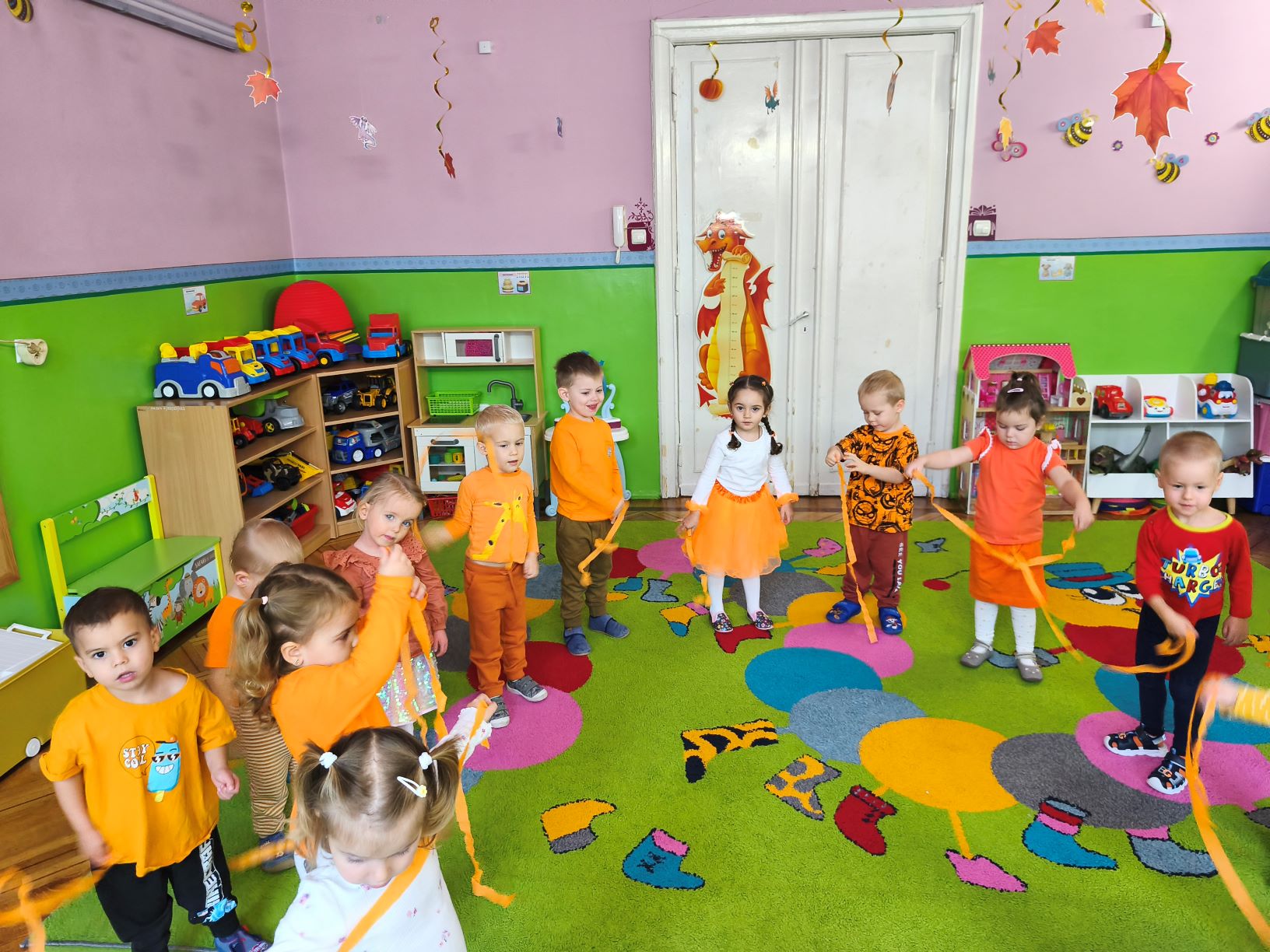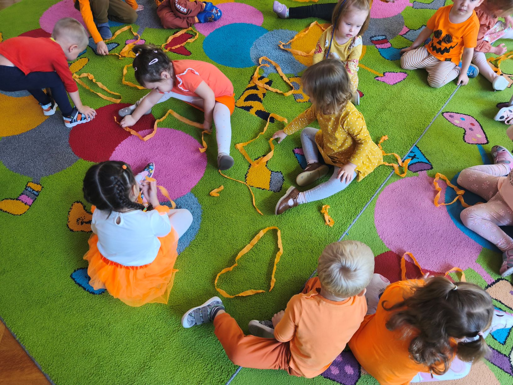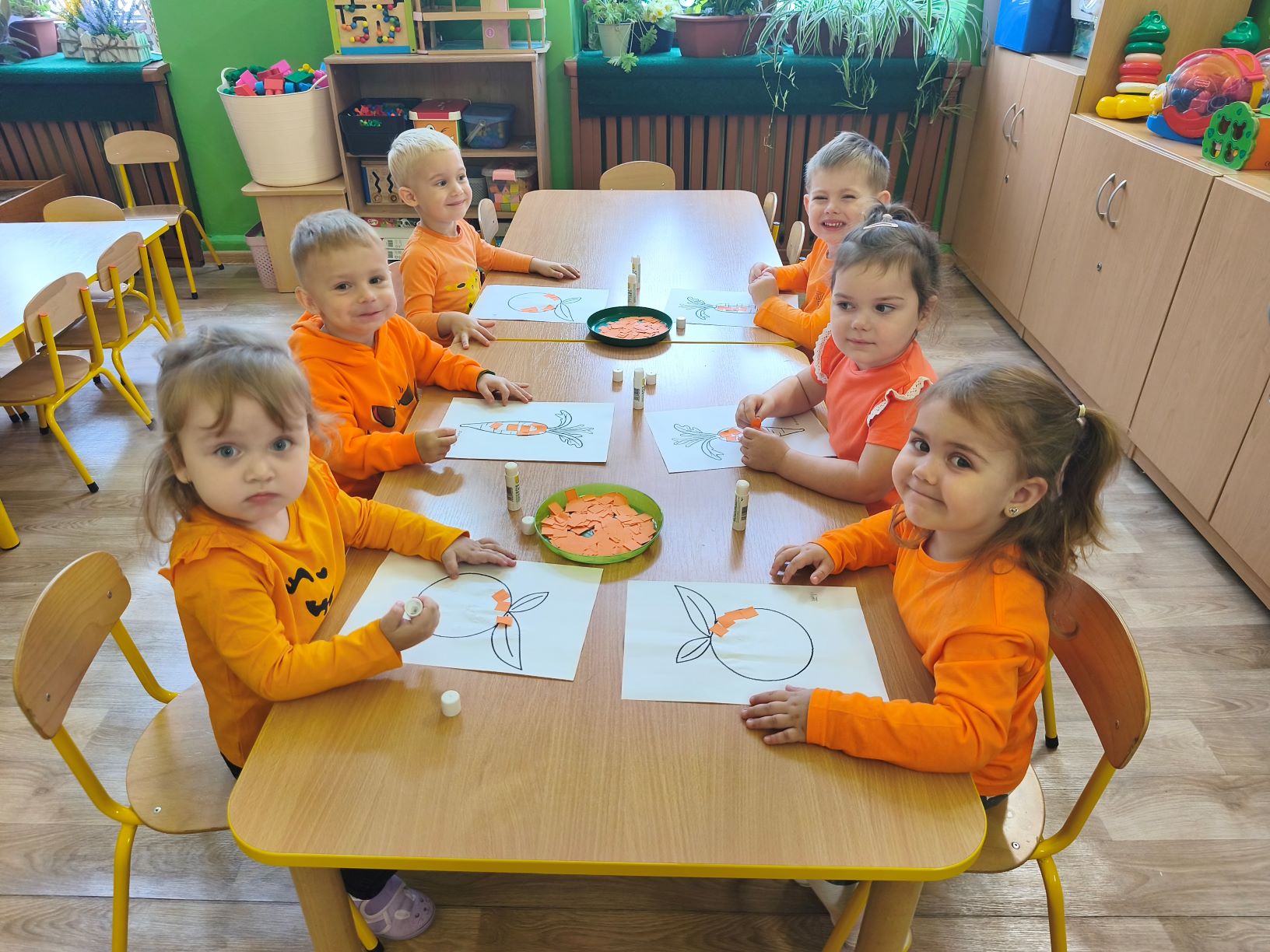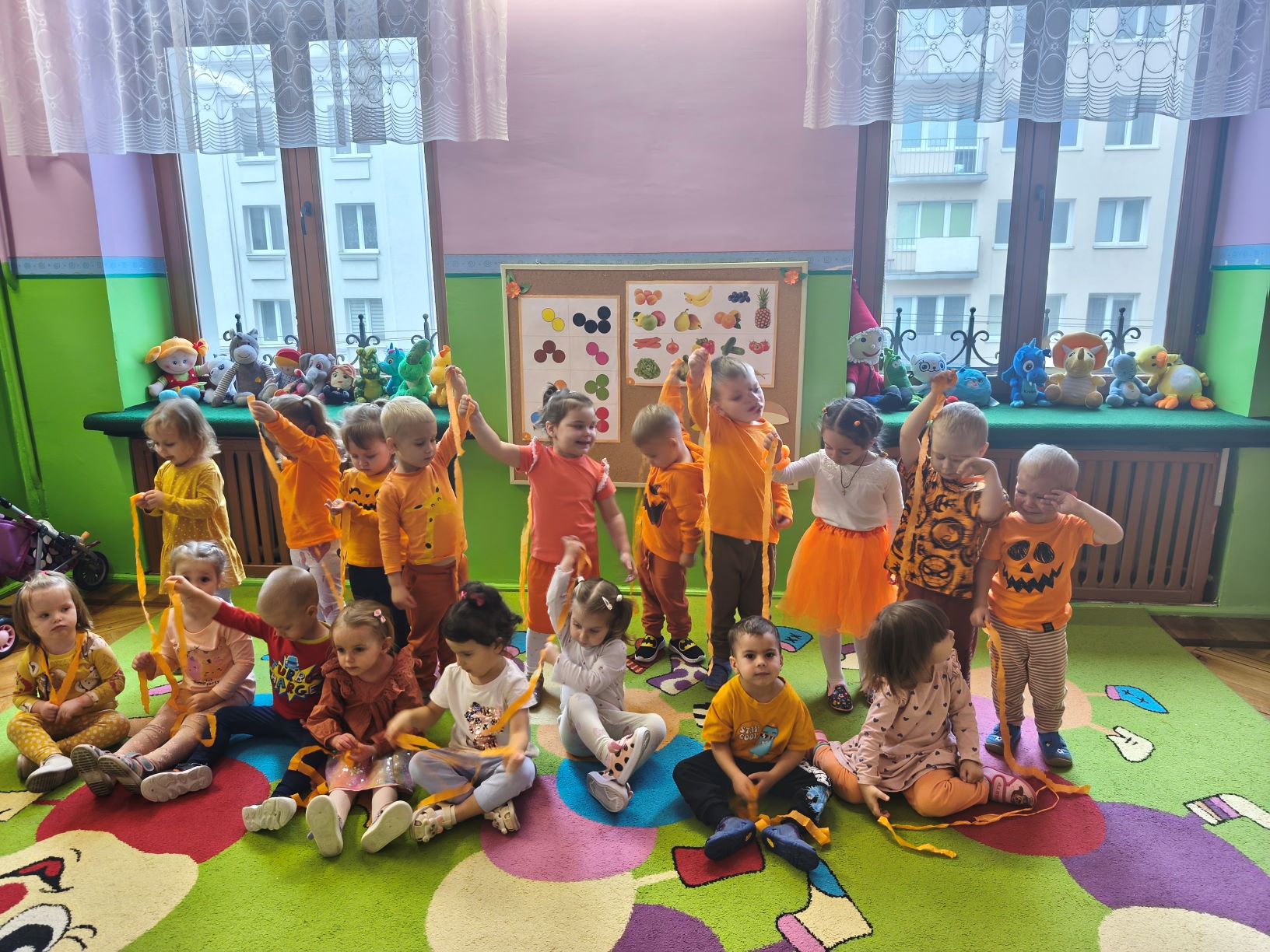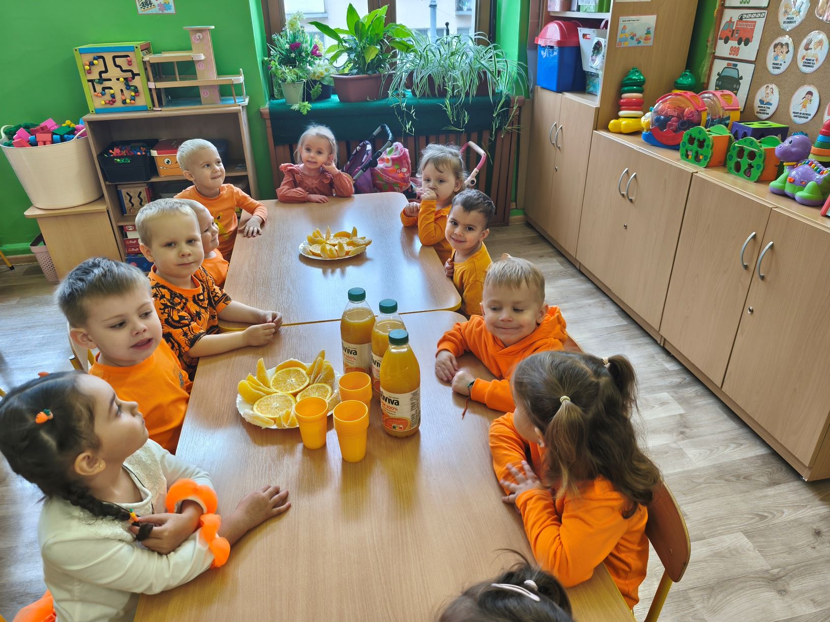 W środę 15 października odbył się w przedszkolu dzień koloru pomarańczowego. Tego dnia dzieci przyszły ubrane na pomarańczowo. Podczas zajęć dzieci utrwaliły nazwę i wygląd koloru pomarańczowego. "Smoki" brały udział w zabawach ruchowych z wykorzystaniem pomarańczowych wstążek. Wykonały również pomarańczową pracę plastyczną - z wykorzystaniem kawałków pomarańczowego papieru wyklejały obrazek marchewki i pomarańczy. Po zajęciach na dzieci czekał pomarańczowy poczęstunek - sok pomarańczowy i pomarańcze.