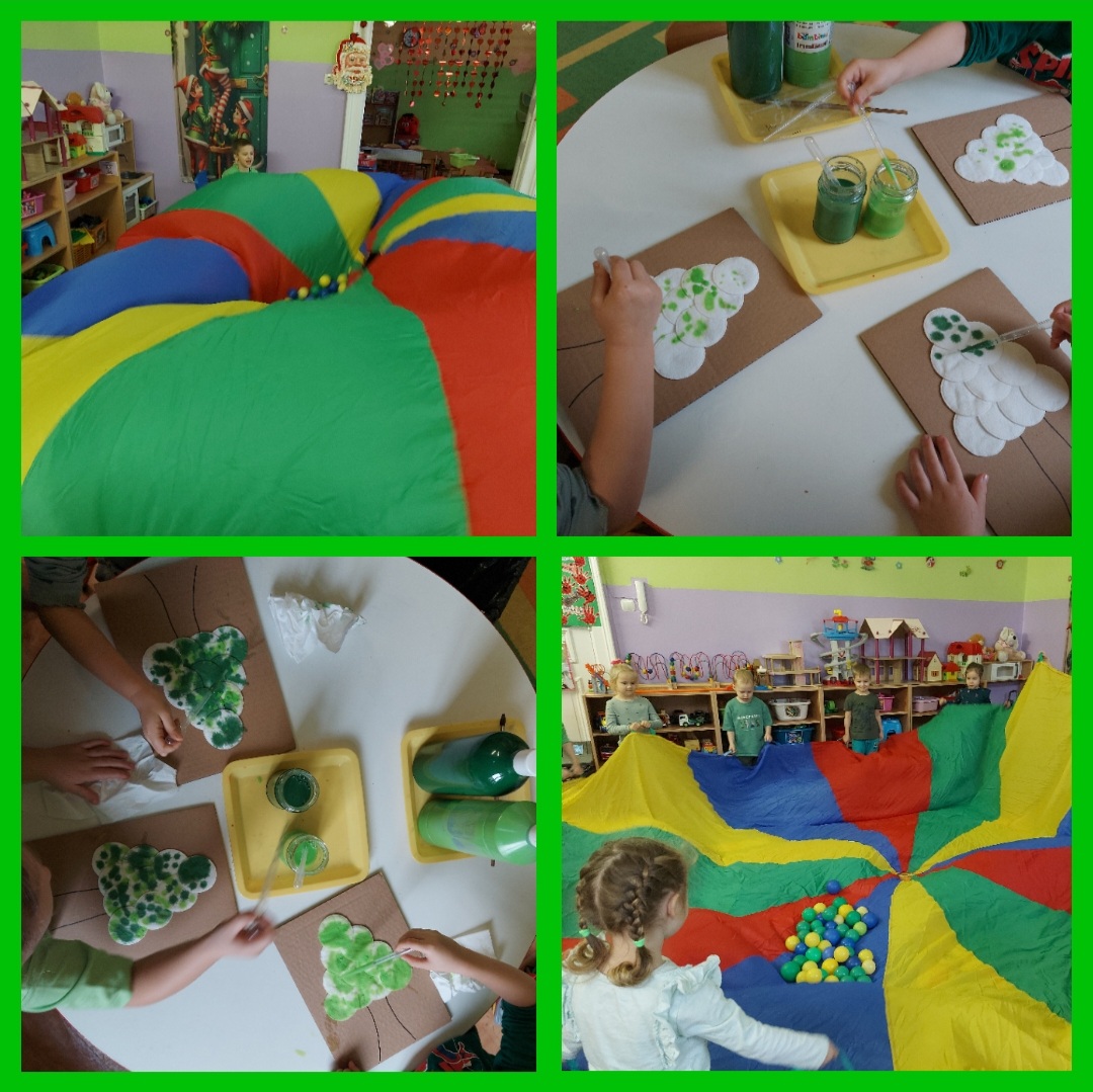 Kolor zielony obecny był w naszych strojach, działaniach edukacyjnych i odnalezionych zabawkach ... a chusta animacyjna próbowała razem z nami "złowić" zielone piłeczki. Nasze prace plastyczne ukazały liczne odcienie zieleni zaprezentowane w zjawiskowych choinkach.