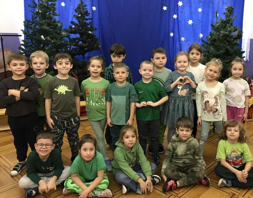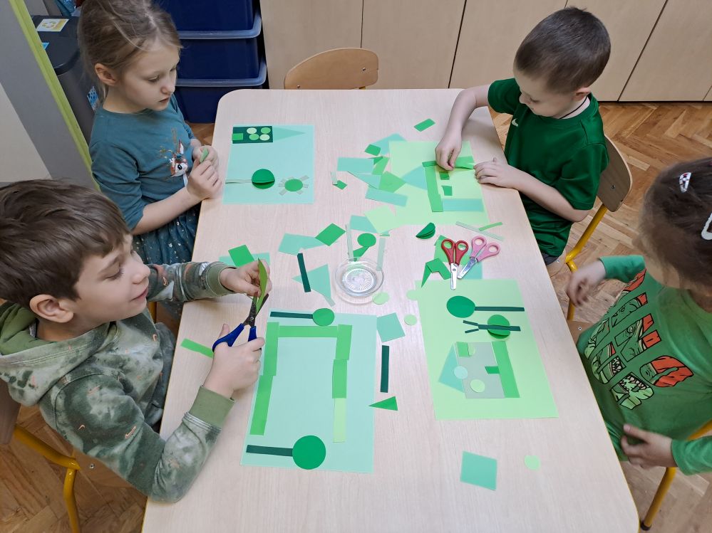 W grudniu w naszym przedszkolu obchodziliśmy dzień koloru zielonego. Nasza grupa podczas swobodnych rozmów wypowiadała się na temat co to jest dom, jakie są ich rodzaje, charakterystyczne cechy. Po zebraniu klocków w zielonym kolorze dzieci budowały wspólnie dom. Dzieci tworzyły na kartonach zielone miasta z różnych figur geometrycznych oraz własnoręcznie wyciętych elementów. Prace wyszły piękne i różnorodne. Na zakończenie było również wspólne zdjęcie.