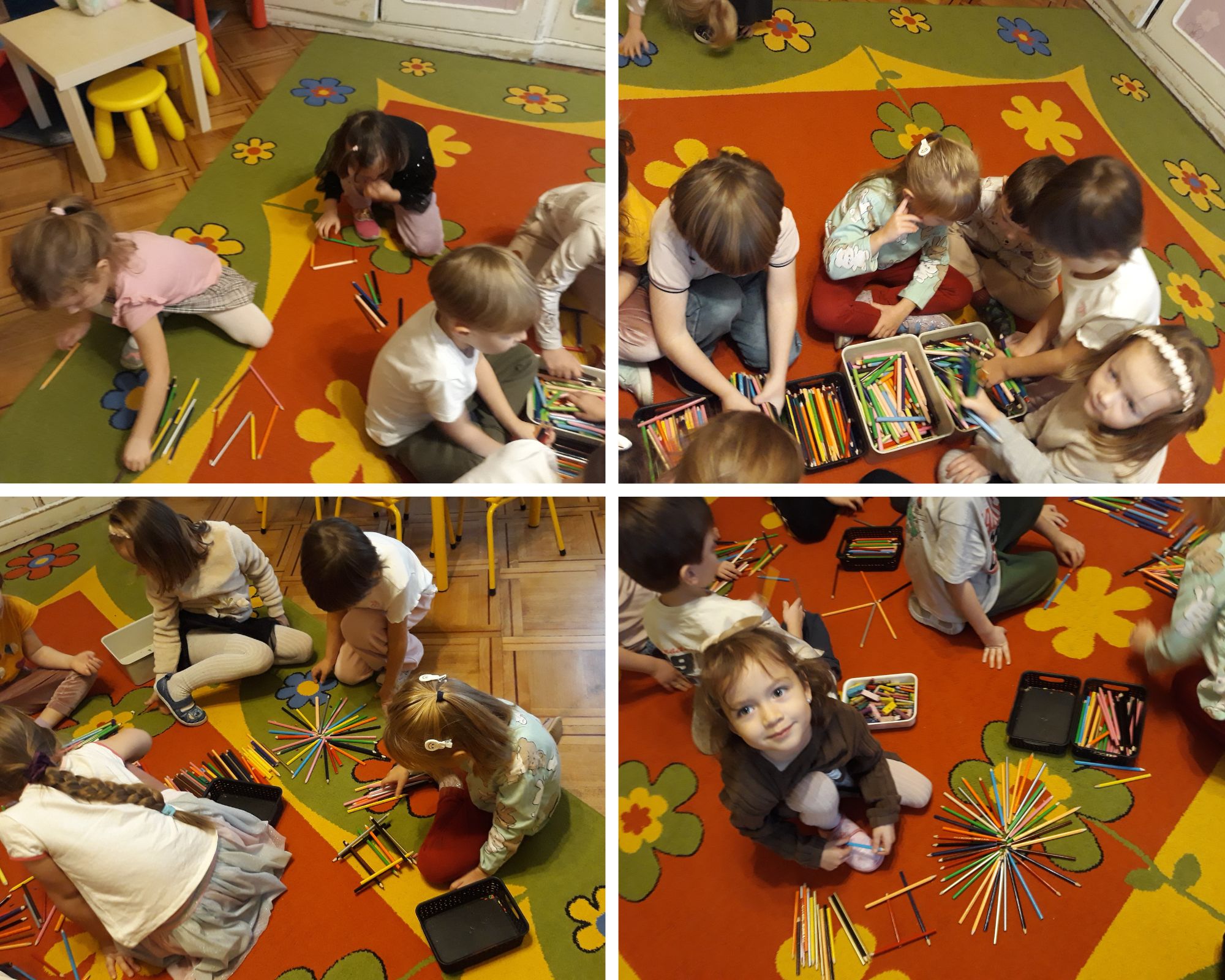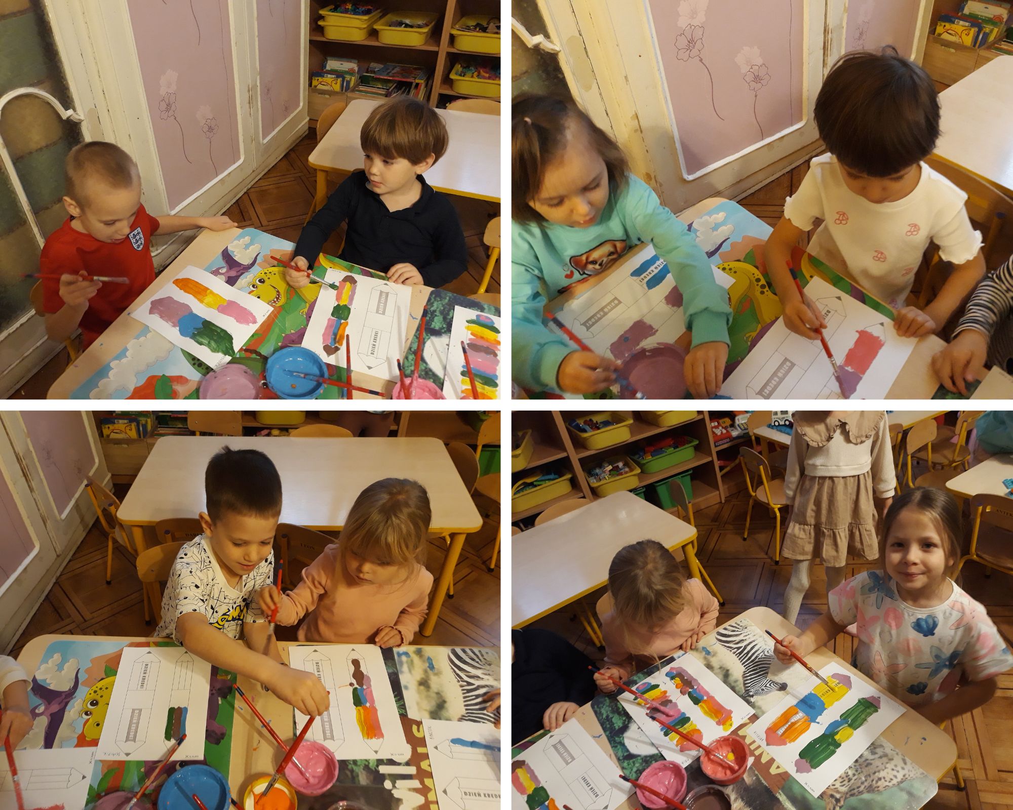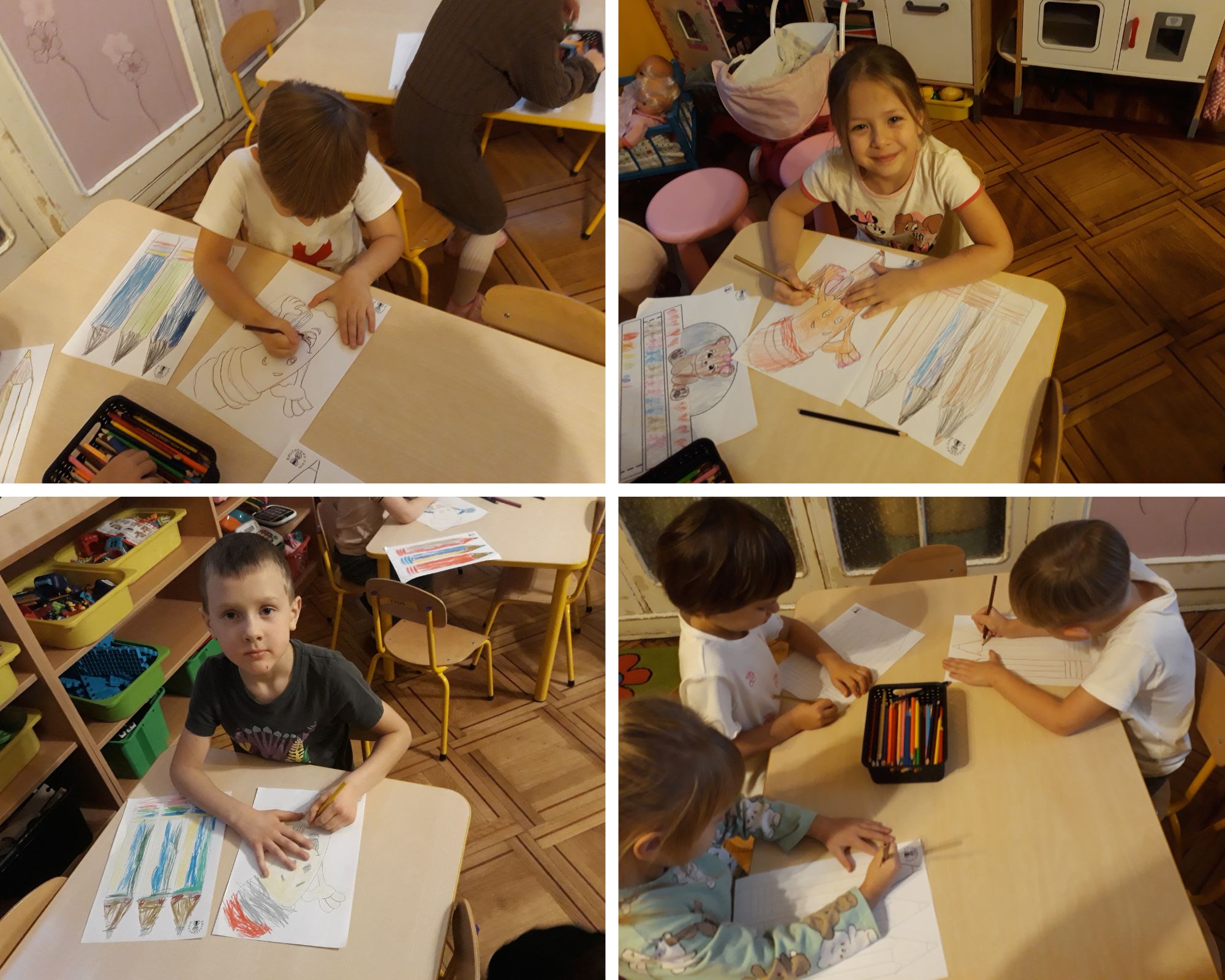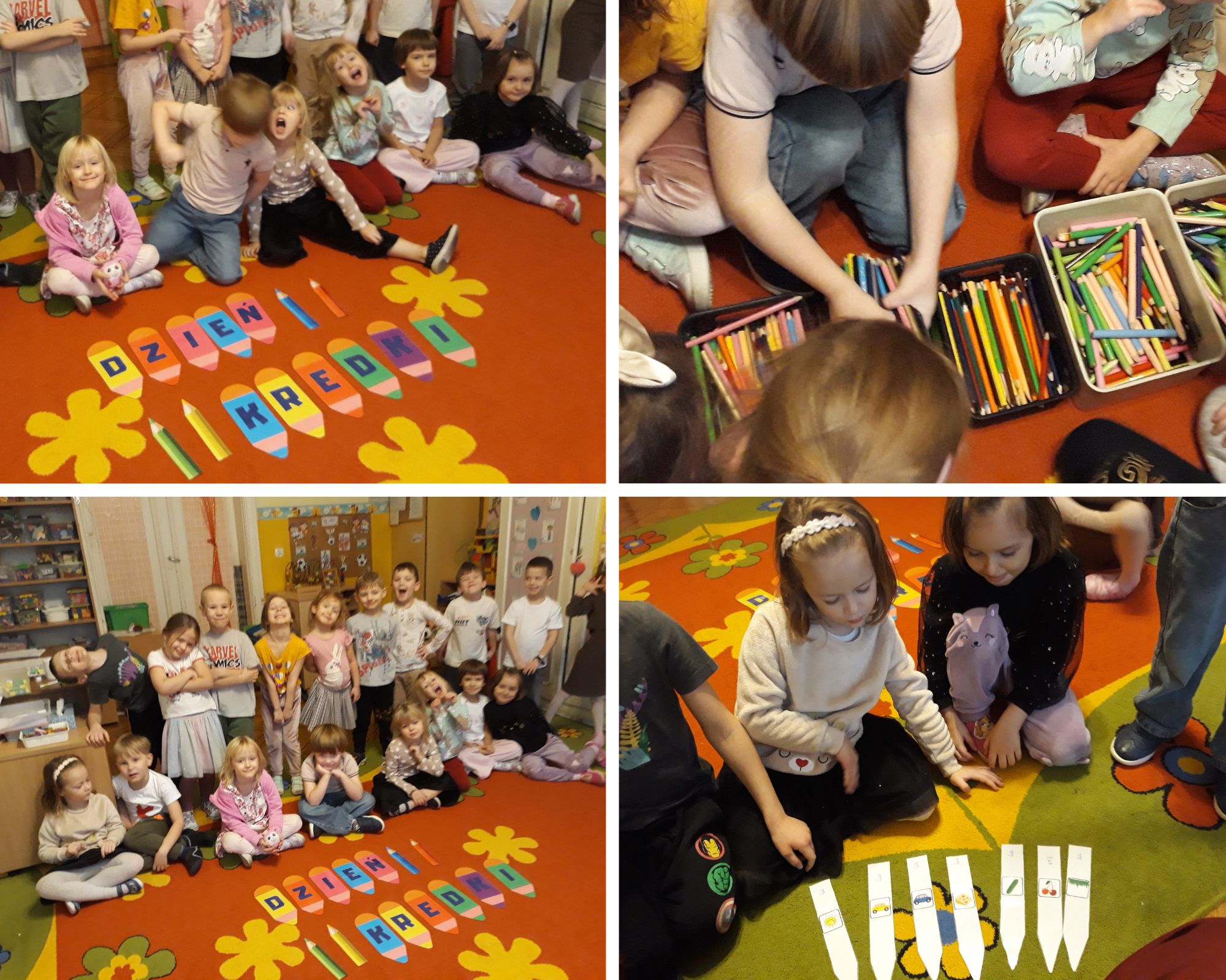 Najpierw posegregowaliśmy nasze kredki według kolorów. Odgadywaliśmy co kredka narysowała w danym kolorze – "operując" latarką. Bawiliśmy się przy piosence „Kolorowe kredki”. Malowaliśmy emblematy kredek farbami, a następnie je wycinaliśmy. Burza mózgów zainspirowała nas do dalszych działań „Kredka nie tylko może być do rysowania”. Budowaliśmy całą grupą kredkowe miasto. Ćwiczyliśmy nasze umiejętności grafomotoryczne, rysując kontury kredek po śladzie i kolorując je.