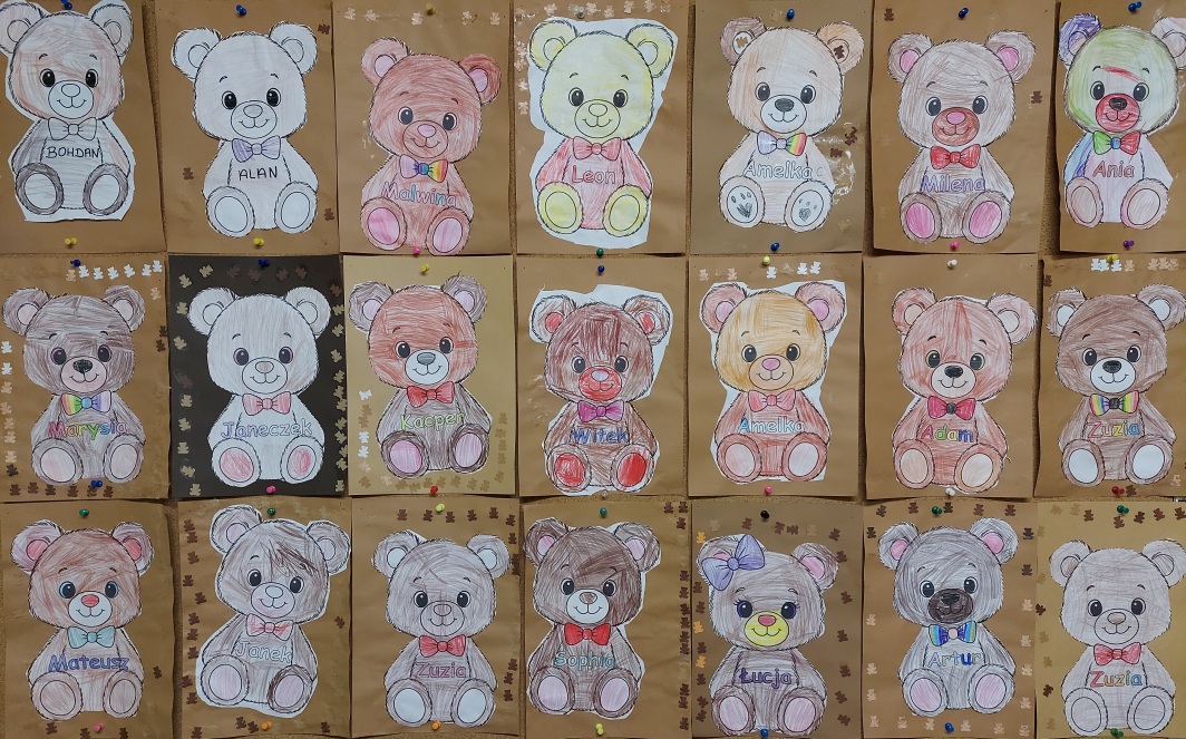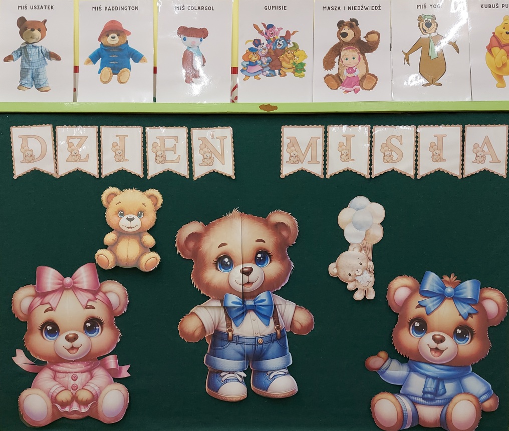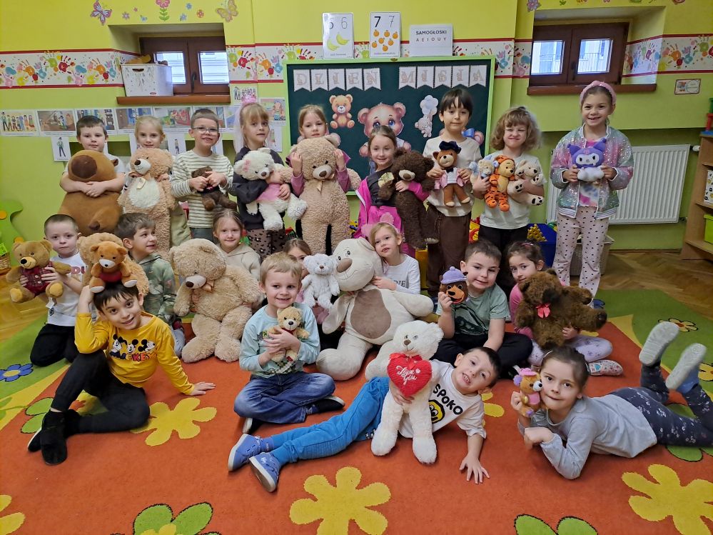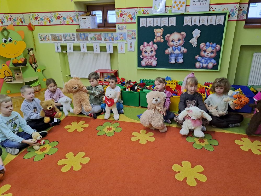 W listopadzie obchodziliśmy "Dzień Pluszowego Misia". W tym dniu każde dziecko przyniosło do przedszkola swojego ukochanego misia i przedstawiło go pozostałym dzieciom podając imię i ciekawostki z nim związane. Wspólnie bawiliśmy się do piosenki „Do przedszkola przyszedł miś” jednocześnie manipulując i używając zwrotów na, pod, obok, za itd. Dzieci wykonały misie z własnym imieniem kolorując je, wycinając i ozdabiając małymi postaciami o kształcie misia. Każdy uczestnik dostał medal z misiem, a pluszaki towarzyszyły w zabawie do późnych godzin w przedszkolu.