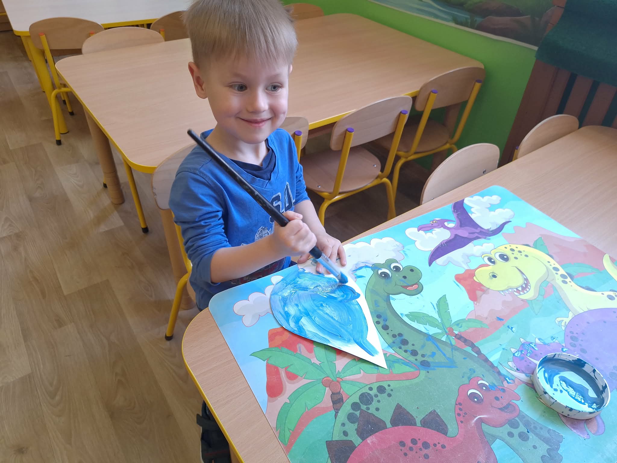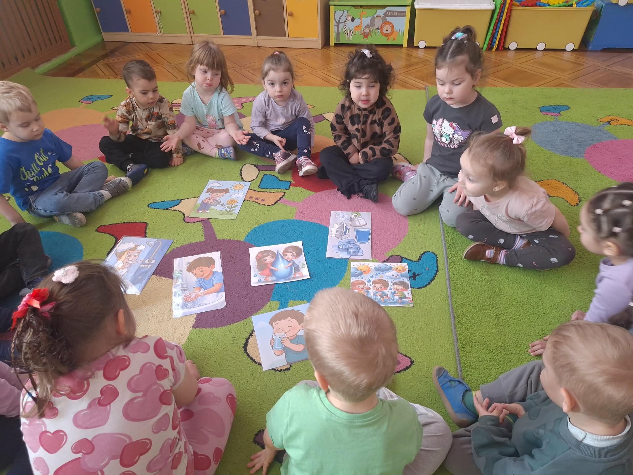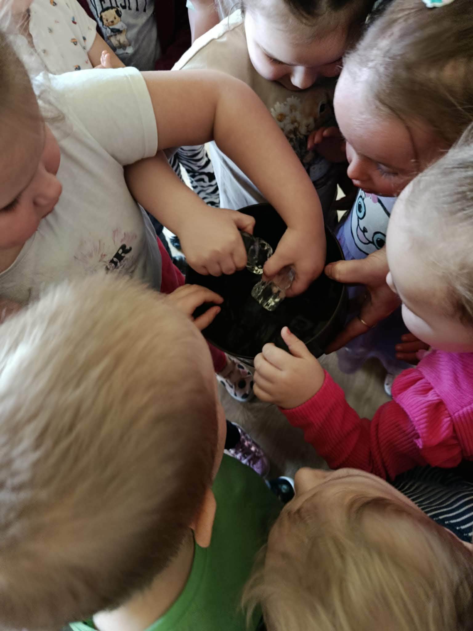 W naszej grupie realizowaliśmy zajęcia na temat wody. Dzieci uczyły się do czego potrzebujemy wody, jak należy ją oszczędzać. Robiliśmy doświadczenie parowania wody, oglądaliśmy bryłki lodu. Poznawaliśmy właściwości wody – kolor, smak itp. Dzieci wykonały kropelkę wody posługując się pędzlem i farbami.