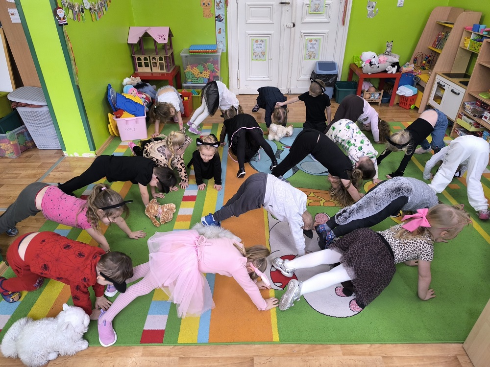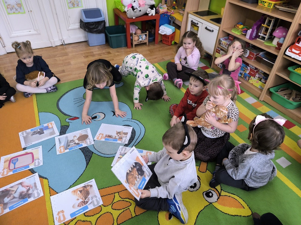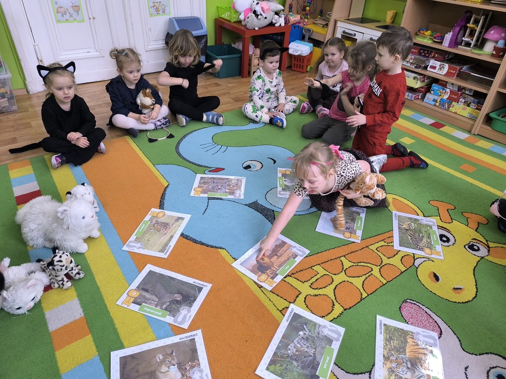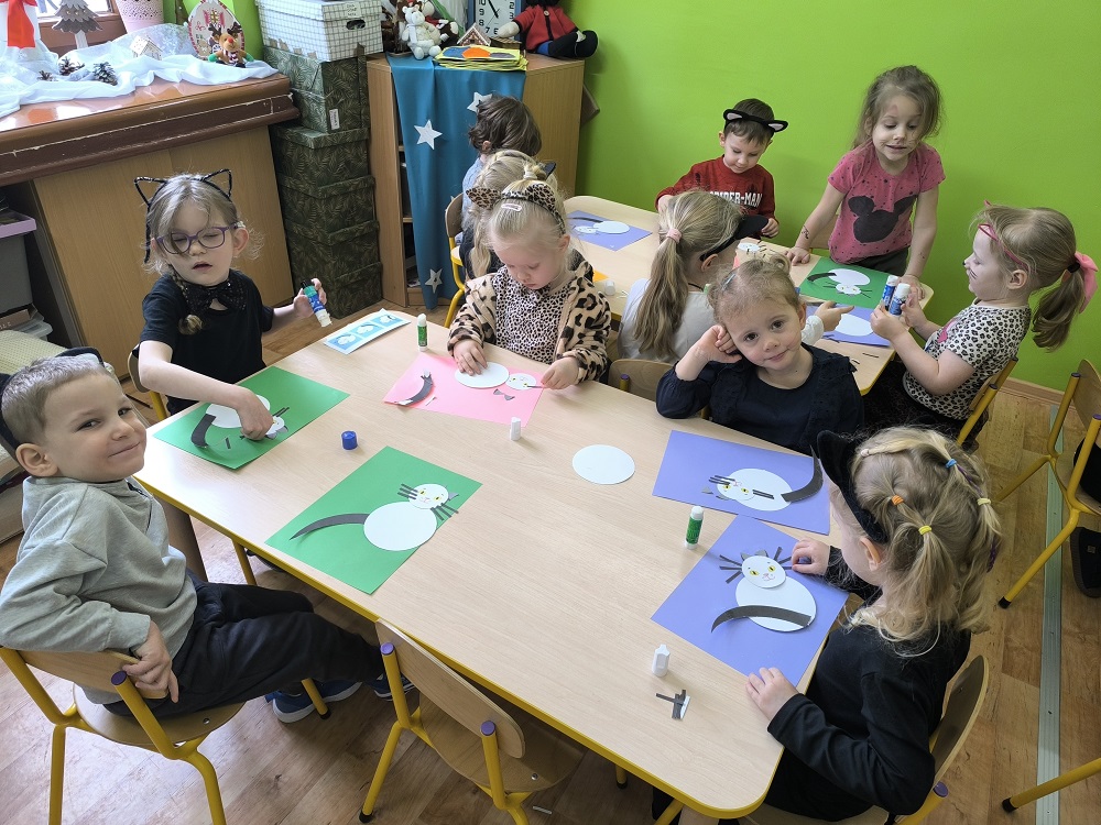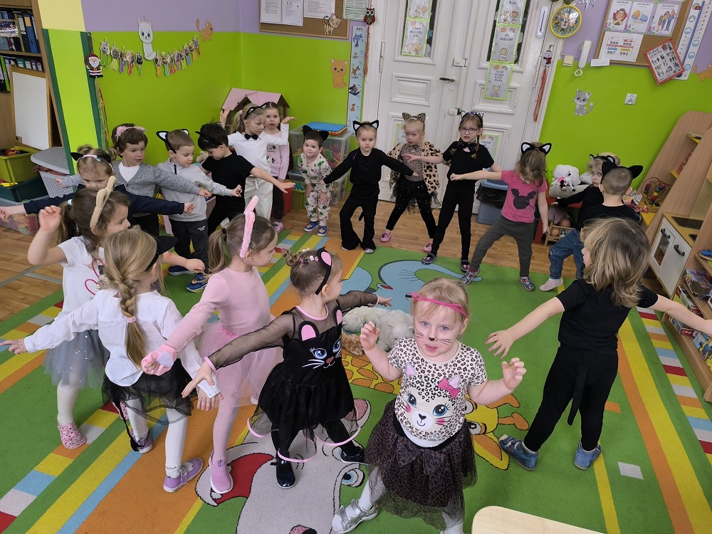 We wtorek, 17 lutego nasza grupa obchodziła „Światowy Dzień Kota”. Spotkanie rozpoczęło się wspólną zabawą, przy znanej wszystkim piosence ”Uciekaj myszko do dziury”. Dzieci z zainteresowaniem oglądały ilustracje różnych kotów, rozwiązywały zagadki o kotach, słuchały wiersza ”Kotek”, aktywnie uczestniczyły w zabawie w formie opowieści ruchowej miaucząc, robiąc koci grzbiet, mrucząc i chlipiąc mleczko. Wszystkie dzieci upodobniły się do czworonożnych przyjaciół, poprzez wymalowane na swoich twarzach piękne noski, wąsy i typowe dla kotków uszka. Dzieci oglądały książki o tych tajemniczych zwierzętach, zapoznały się z kocimi obyczajami oraz sposobem pielęgnacji i opieki jakiej wymagają. Były też wesołe „kocie zabawy” przy znanych piosenkach „My jesteśmy kotki dwa”, „Wlazł kotek na płotek” oraz konkursy „Kto szybciej wypije mleko”, „Zabawy z włóczką”, „Z jakiej bajki pochodzą te koty?”.