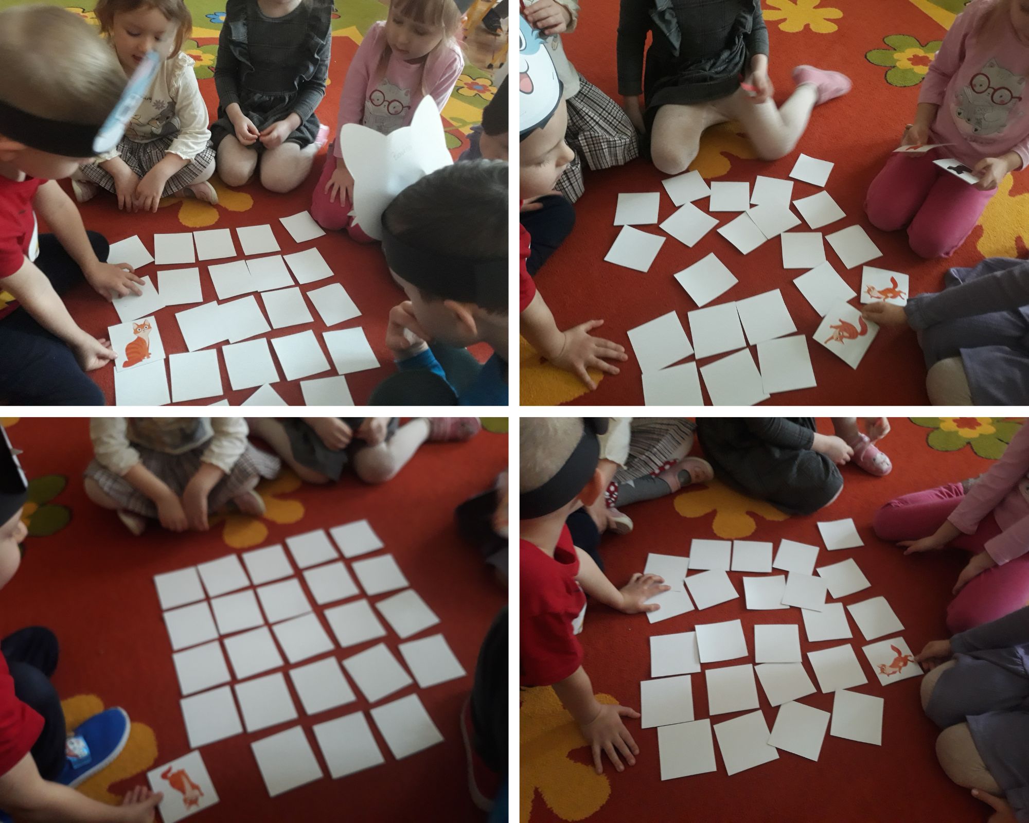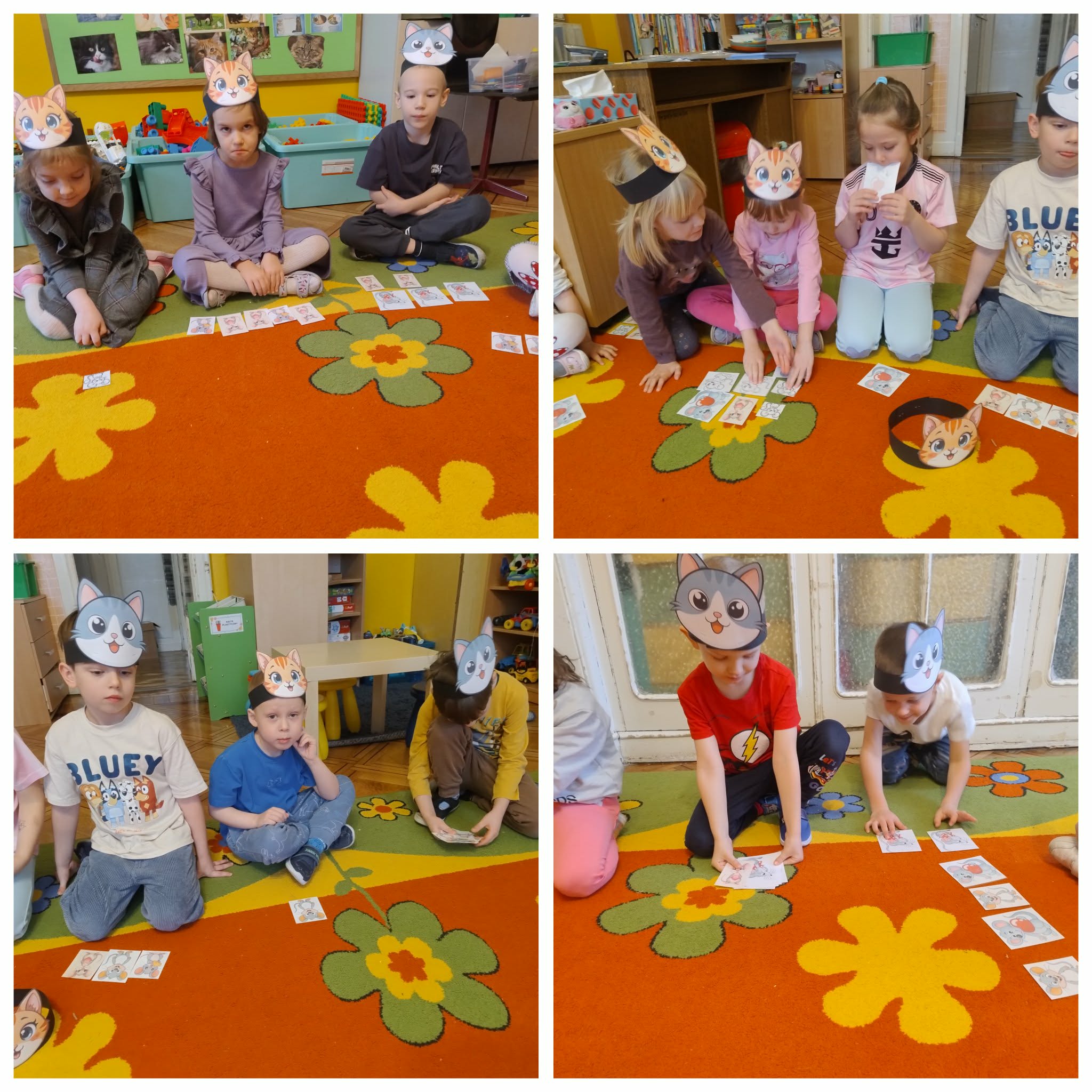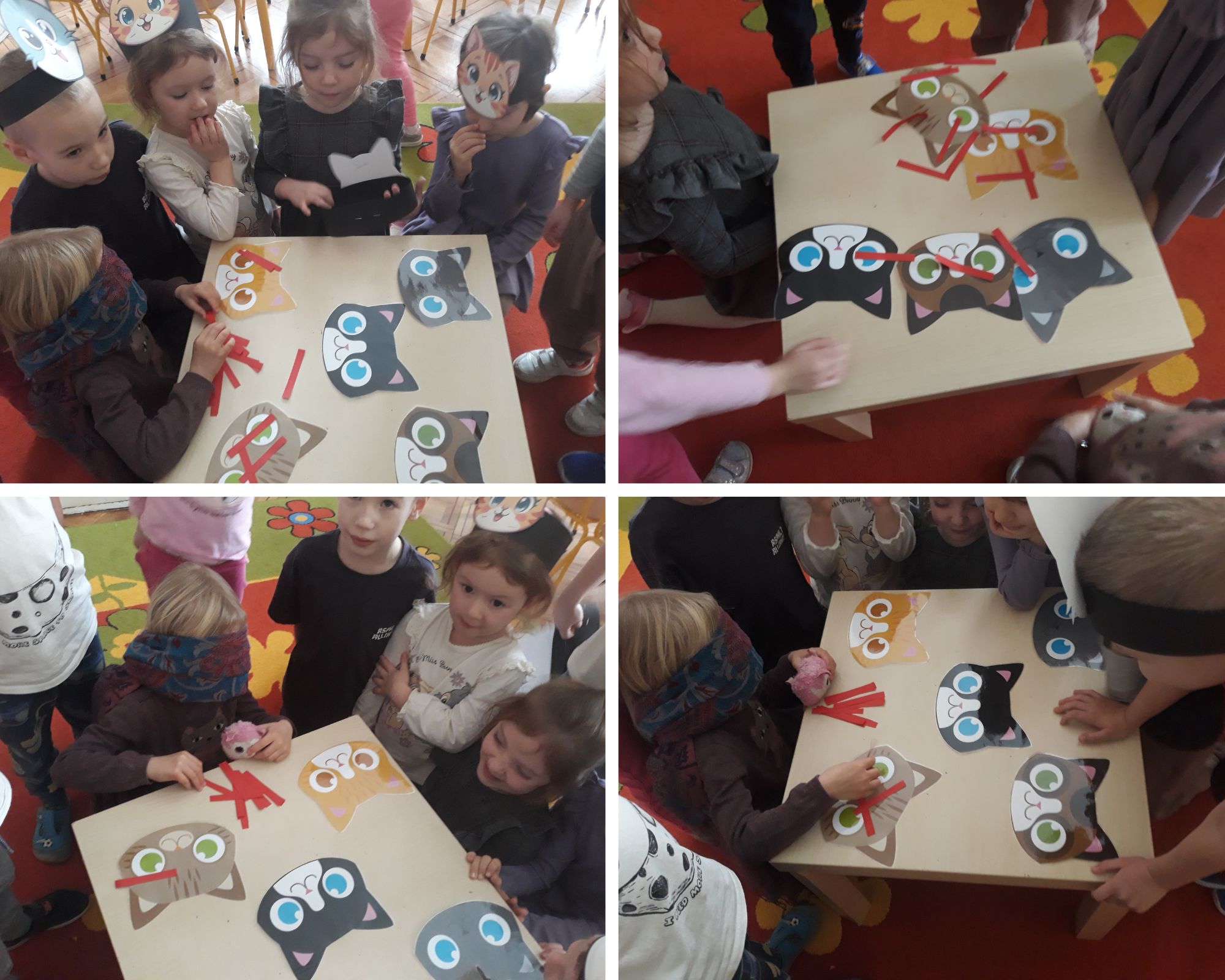 Z tej okazji świętowania "Dnia Kota" spotkaliśmy się również z zaprzyjaźnioną z nami grupą "Gwiazdeczek". Bawiliśmy się przy piosenkach o kotach. Układaliśmy pocięte obrazki na wiele elementów w małych grupach. Szukaliśmy kolegi, który miał drugą połowę obrazka tego samego kota. Bawiliśmy się w zabawę naszych dziadków, czyli "Uciekaj myszko do dziury". Kilka osób spróbowało, z zawiązanymi oczami, dodać wąsy na sylwecie głowy kota. Śmiechu było co nie miara. Szukaliśmy także emblematu kota i jego cienia. Braliśmy udział w grze memory. Na koniec zabawy kolorowaliśmy sylwetkę kotka.