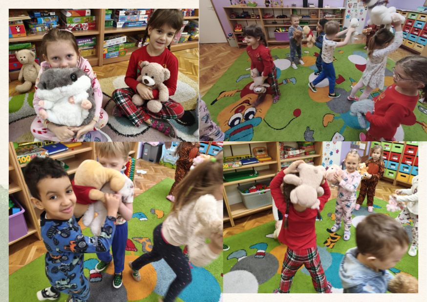 Dzieci dowiedziały się, że sen pomaga nam rosnąć, nabierać sił, lepiej się uczyć i mieć dobry humor. Wspólnie zastanawialiśmy się, co warto robić przed snem, a czego lepiej unikać. Były rozmowy o wieczornych rytuałach, czytaniu bajek, wyciszaniu się i przytulaniu. Nie zabrakło też świetnej zabawy! Zamiast popularnej bitwy na poduszki była wesoła bitwa na pluszaki, zabawy ruchowe, relaks przy spokojnej muzyce oraz prezentacja ulubionych piżamek. Śmiechu i radości było co niemiara.
