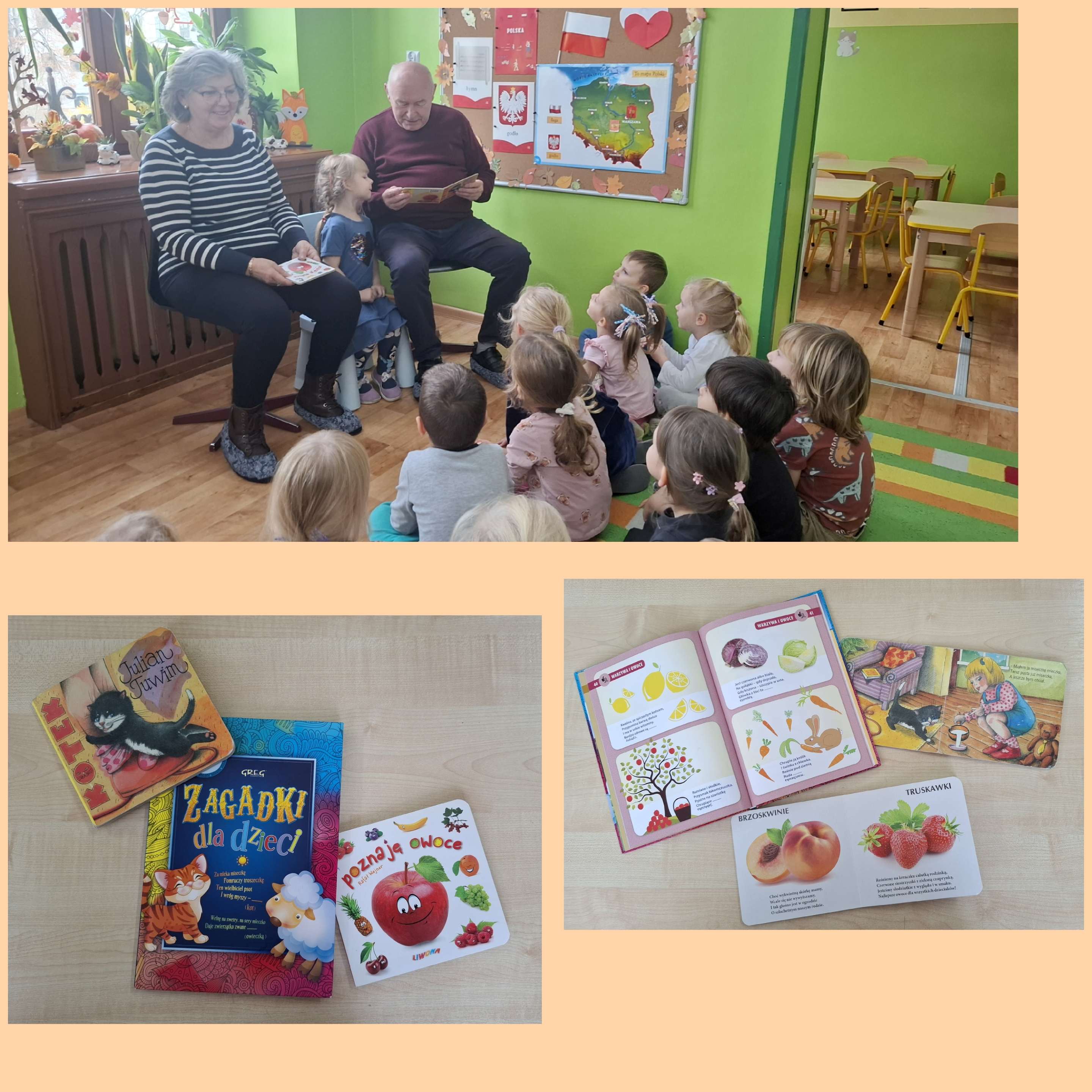 Nasza grupa bierze udział w VII edycji projektu czytelniczego „Wkręceni w czytanie. Rajd po zdrowie”, który promuje zdrowy styl życia i aktywności fizyczne. Realizując jedno z zadań projektu „Zdrowo jemy, dlatego nie chorujemy” zaprosiliśmy naszych gości do rozmowy o tym jakie lubią jeść najbardziej owoce i warzywa oraz o mocy witamin jakie zawierają kolorowe dary natury. Dziadziuś Amelki opowiedział o swojej ogródkowej pasji i jak razem z babcią lubią jeść pyszne zbiory z ich ogródka, np. pomidory, porzeczki, borówki.