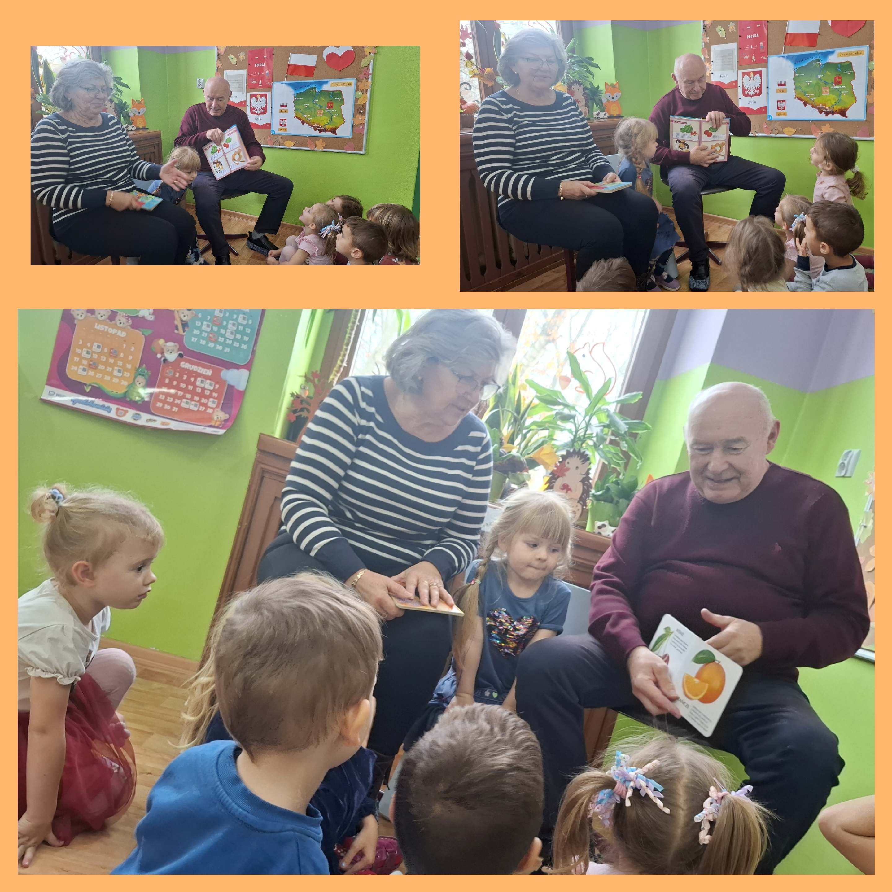 Dzieci bardzo ucieszyły się na wspólne spotkanie z babcią i dziadkiem Amelki przy ciekawych wierszach i zagadkach oraz zabawach muzyczno-ruchowych. Dużo radości mieli także nasi sympatyczni goście. Pani Ewa i pan Janusz opowiadali dzieciom o swoich ulubionych książkach, recytowali wiersze ze swojego dzieciństwa oraz wesoło bawili się z przedszkolakami przy pląsach i zabawach ruchowych.
