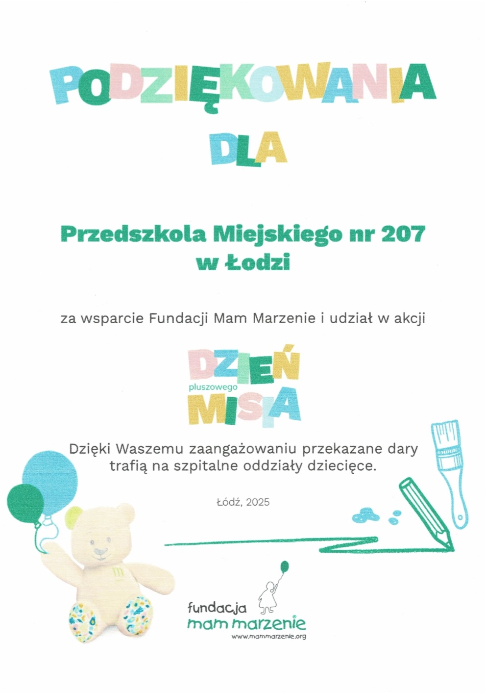 Serdecznie dziękujemy wszystkim, którzy włączyli się w akcję - każda przekazana maskotka kredka czy blok rysunkowy to uśmiech i odrobina nadziei dla tych, którzy najbardziej jej potrzebują. Wspólnie pokazaliśmy, że małe gesty mają wielką moc, a jeden miś potrafi odmienić czyjś dzień.