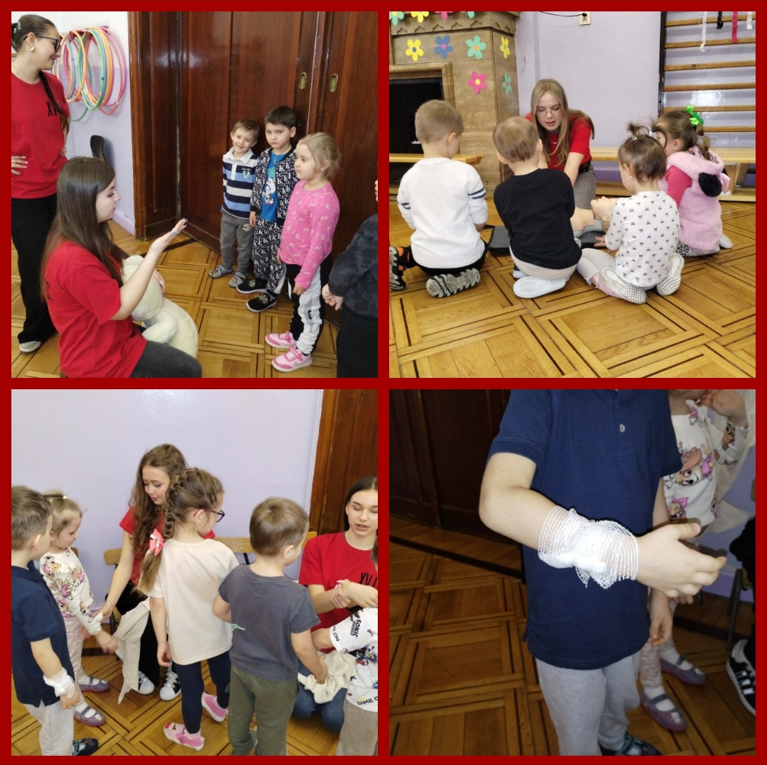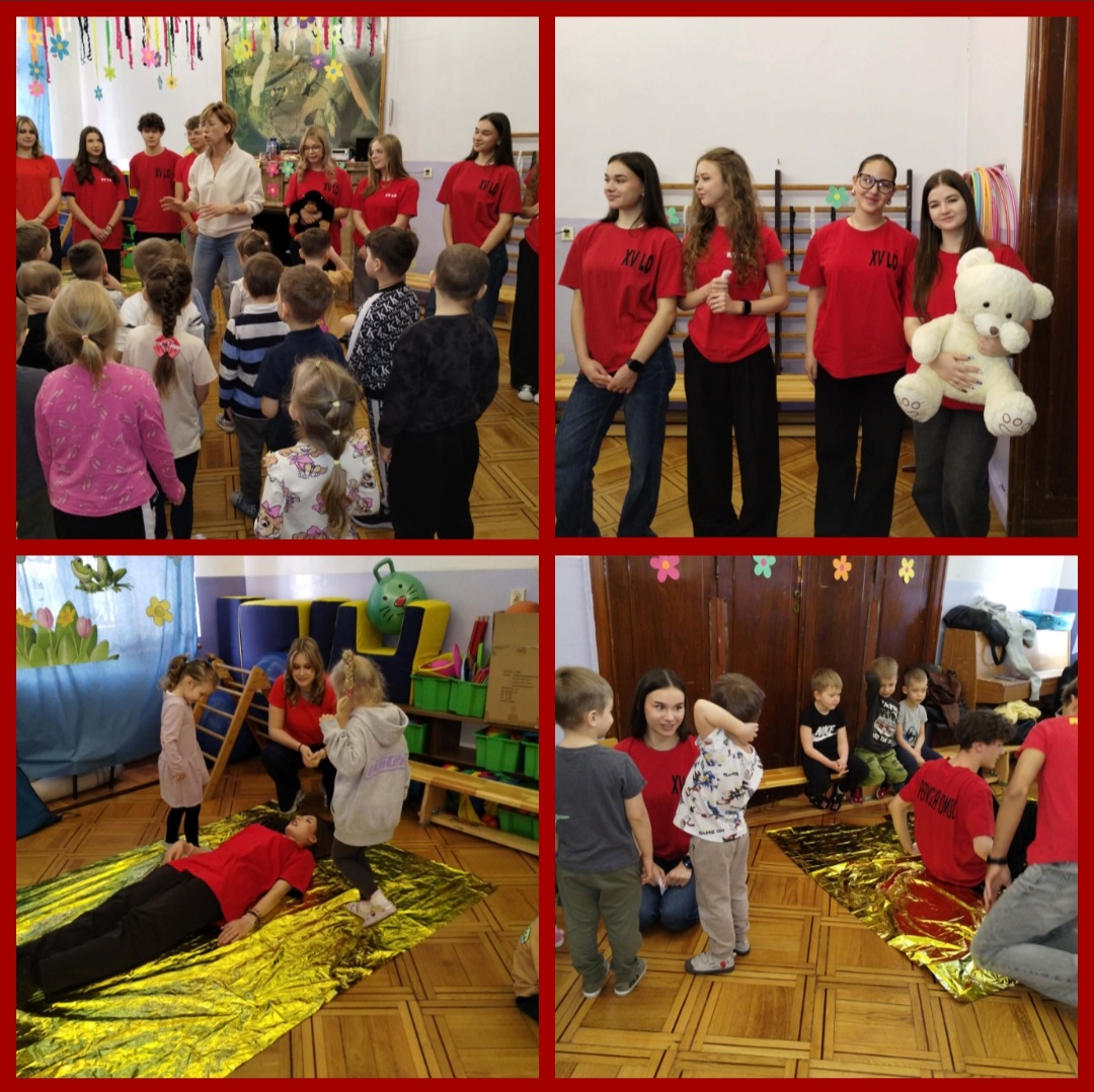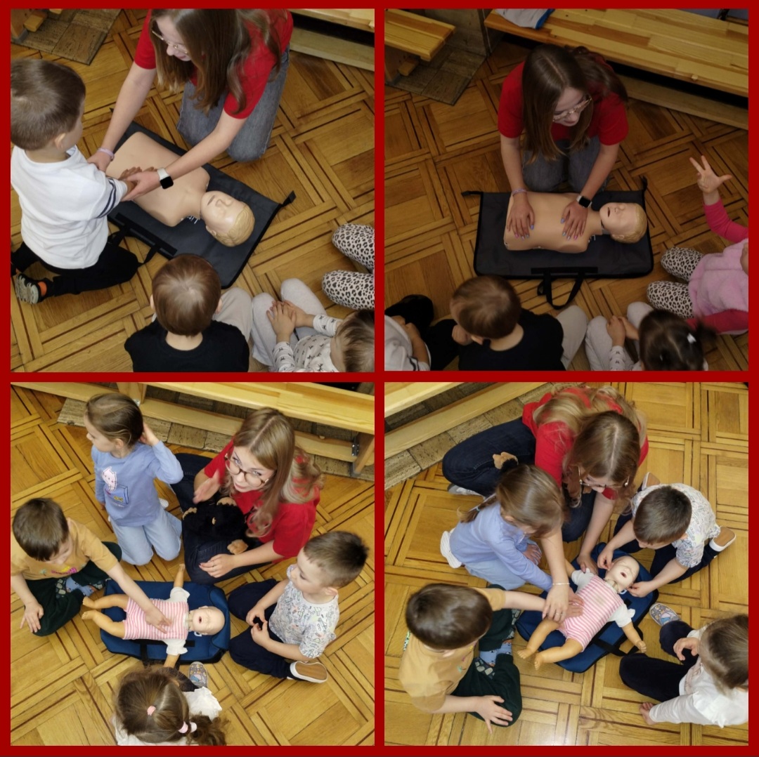 Podczas zajęć przedszkolaki mogły poczuć się jak mali ratownicy. Naszymi instruktorami była młodzież z XV LO imienia Jana Kasprowicza w Łodzi, z klasy 3c o profilu ratownictwo medyczne, pod opieką nauczycielki p. Magdaleny Danisiewicz. Przedszkolaki podczas zajęć uczyły się: opatrywać rany, układać poszkodowanego w pozycji bezpiecznej, przeprowadzać RKO oraz udzielać pomocy podczas zadławienia.