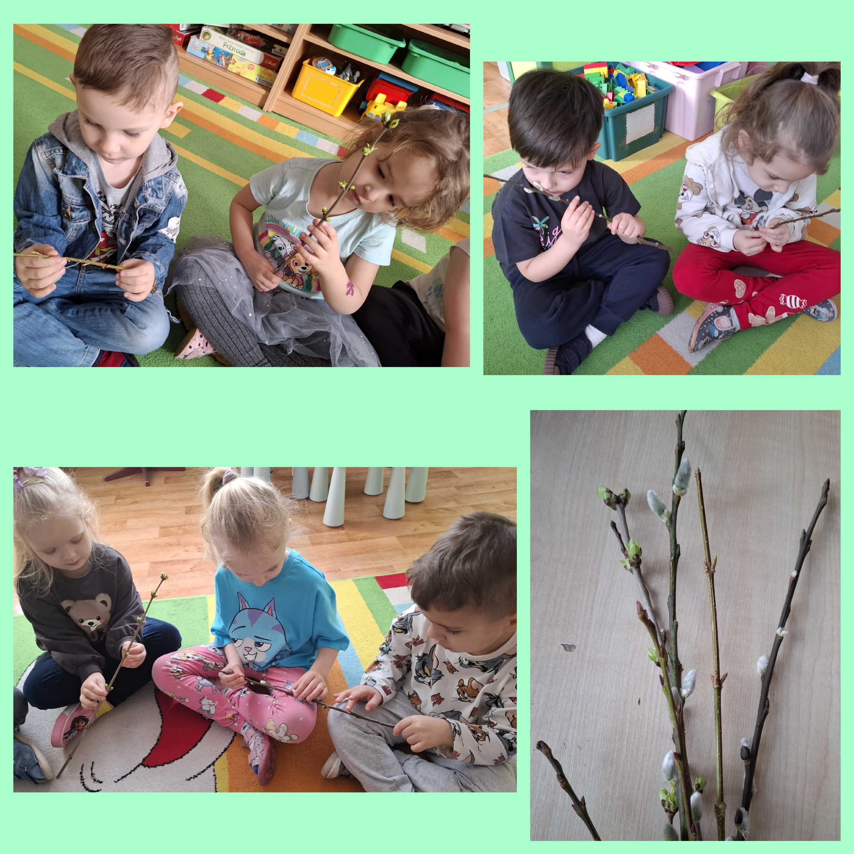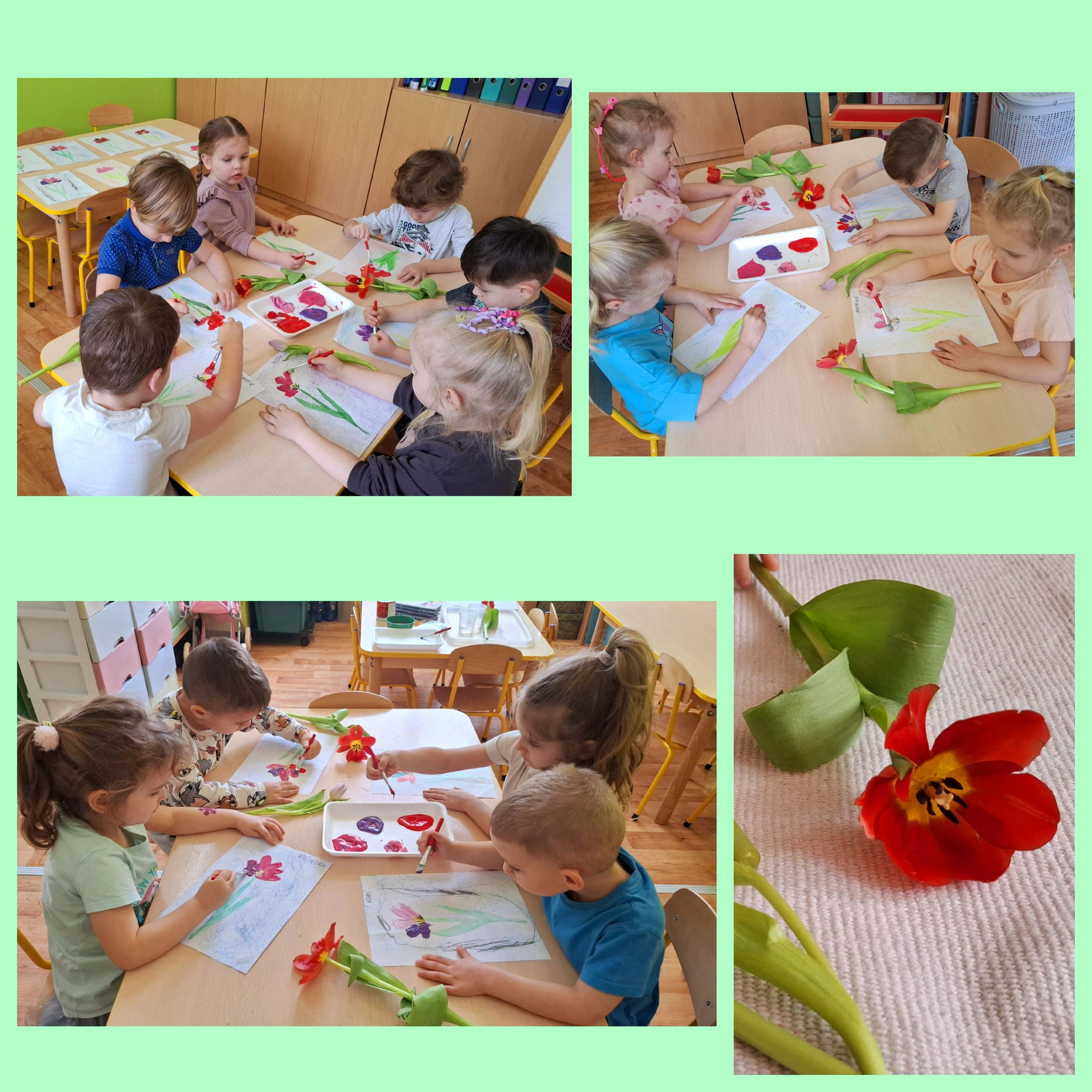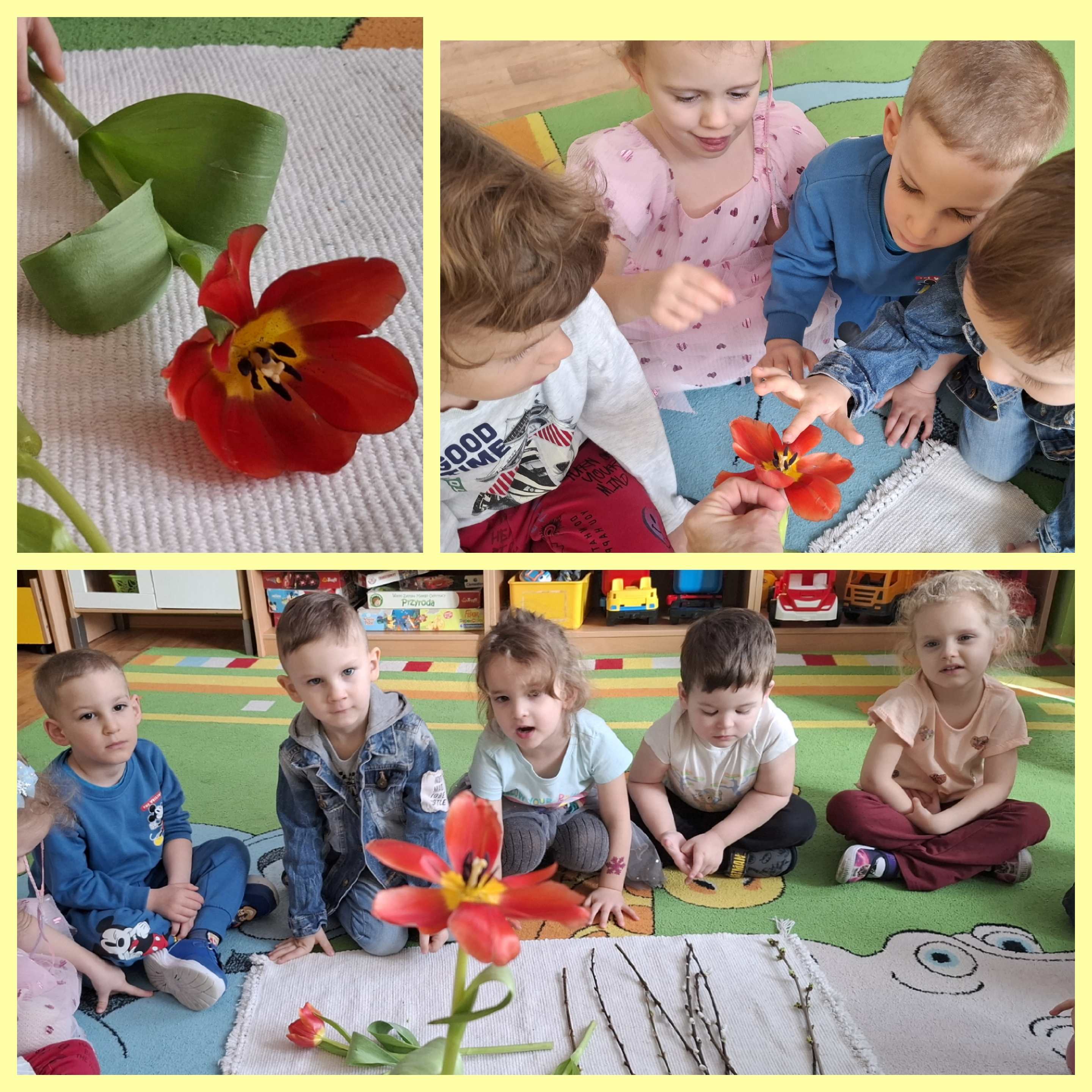 Przedszkolaki z naszej grupy zaciekawione zwiastunami wiosny prowadziły obserwacje przyrodnicze tulipana i gałązek wierzby. Dzieci z dużym zainteresowaniem przyglądały się tym roślinom poznając je polisensorycznie. Oglądając kwiat-tulipan dowiedziały się z jakich części zbudowany jest kwiat (łodyga, liście, kielich, słupek, pręciki). Następnie kolorowały farbami rysunek tulipana. Przyglądały się także wierzbowym kwiatom, czyli baziom. Dzieci bardzo interesowało także to jaki zapach mają zaprezentowane im rośliny oraz jakie są w dotyku. Nauka przez zabawę sprawiła przedszkolakom dużo frajdy i rozbudziła w nich zainteresowanie przyrodą.
