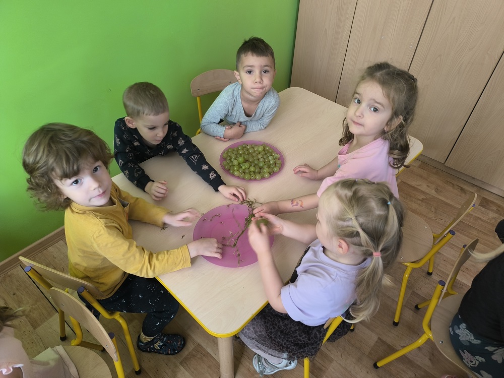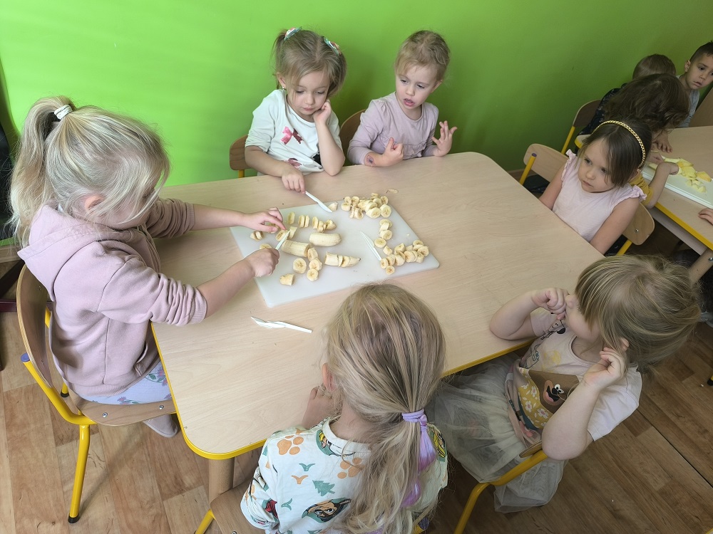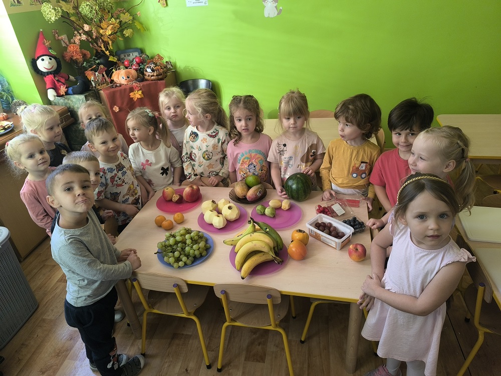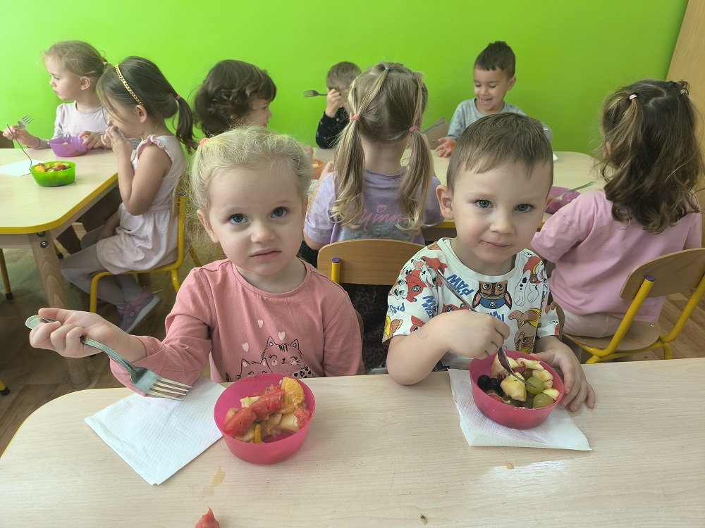 W październiku „Kotki” zapoznały się z tematyka zdrowego stylu życia. Nabyły umiejętność nazywania warzyw i owoców. Dowiedziały się jakie witaminy mają poszczególne warzywa i owoce. W celu promowania zasad wspólnego żywienia i stylu życia dzieci postanowiły wykonać pyszną sałatkę owocową pełną witamin. Przyniosły więc różne świeże owoce. Wszyscy mieli soczyste minki na ich widok. Każdy dostał tackę i nożyk. Dzieci samodzielnie kroiły i przyrządzały sałatkę owocową przestrzegając zasad bezpieczeństwa przy posługiwaniu się nożem. Własnoręcznie zrobiona sałatka wyśmienicie wszystkim smakowała. Dzięki zajęciom kulinarnym dzieci nabywają umiejętność planowania i organizowania swoich działań, rozwijają swoją kreatywność, samodzielność, sprawność manualną. Wspólne przyrządzanie posiłków jest również okazją do wzmocnienia współdziałania i przyjaźni między dziećmi. Było pysznie, kolorowo i zdrowo!